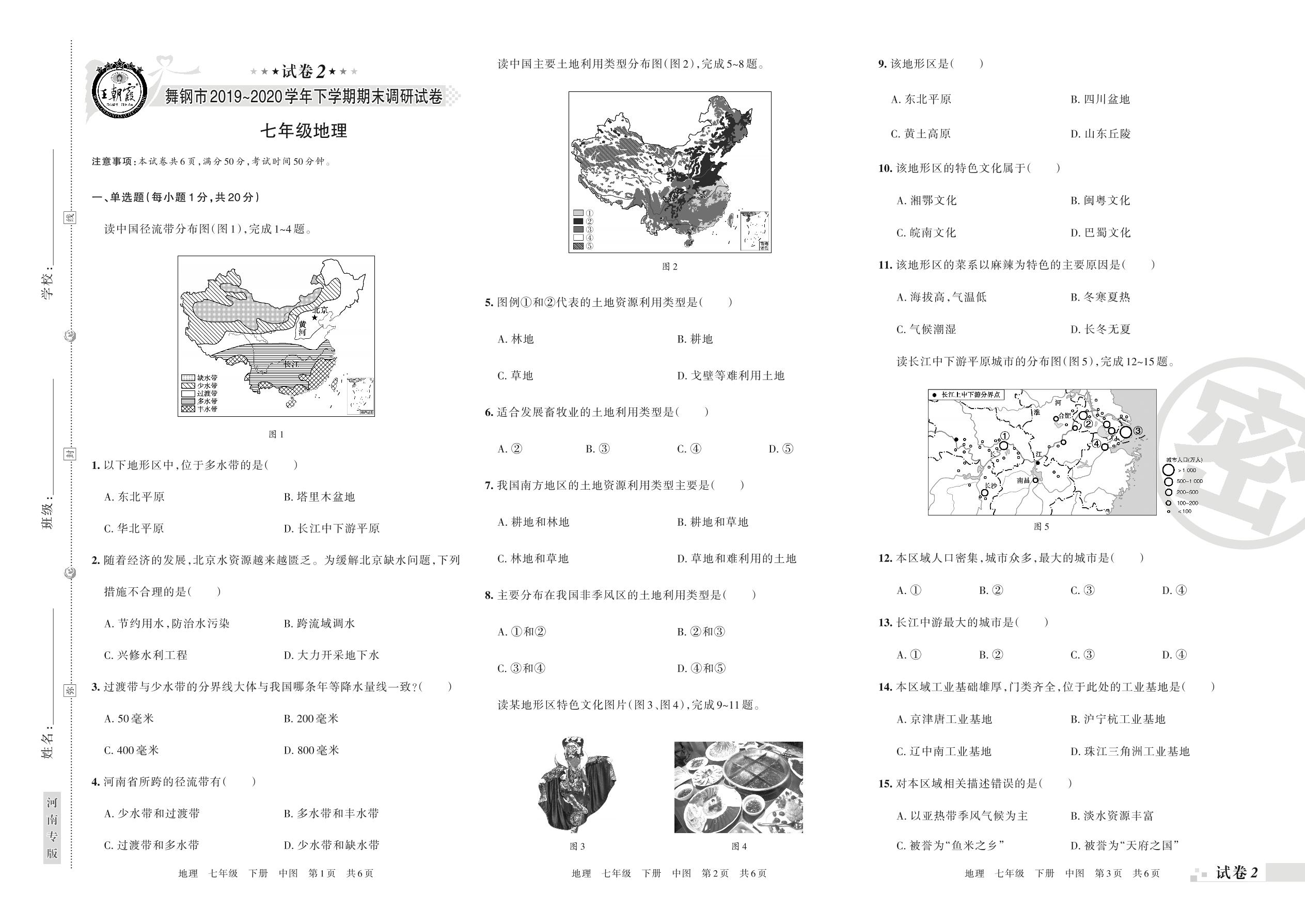 2019-2020学年第二学期舞钢市七年级地理试卷(中图版)【2】