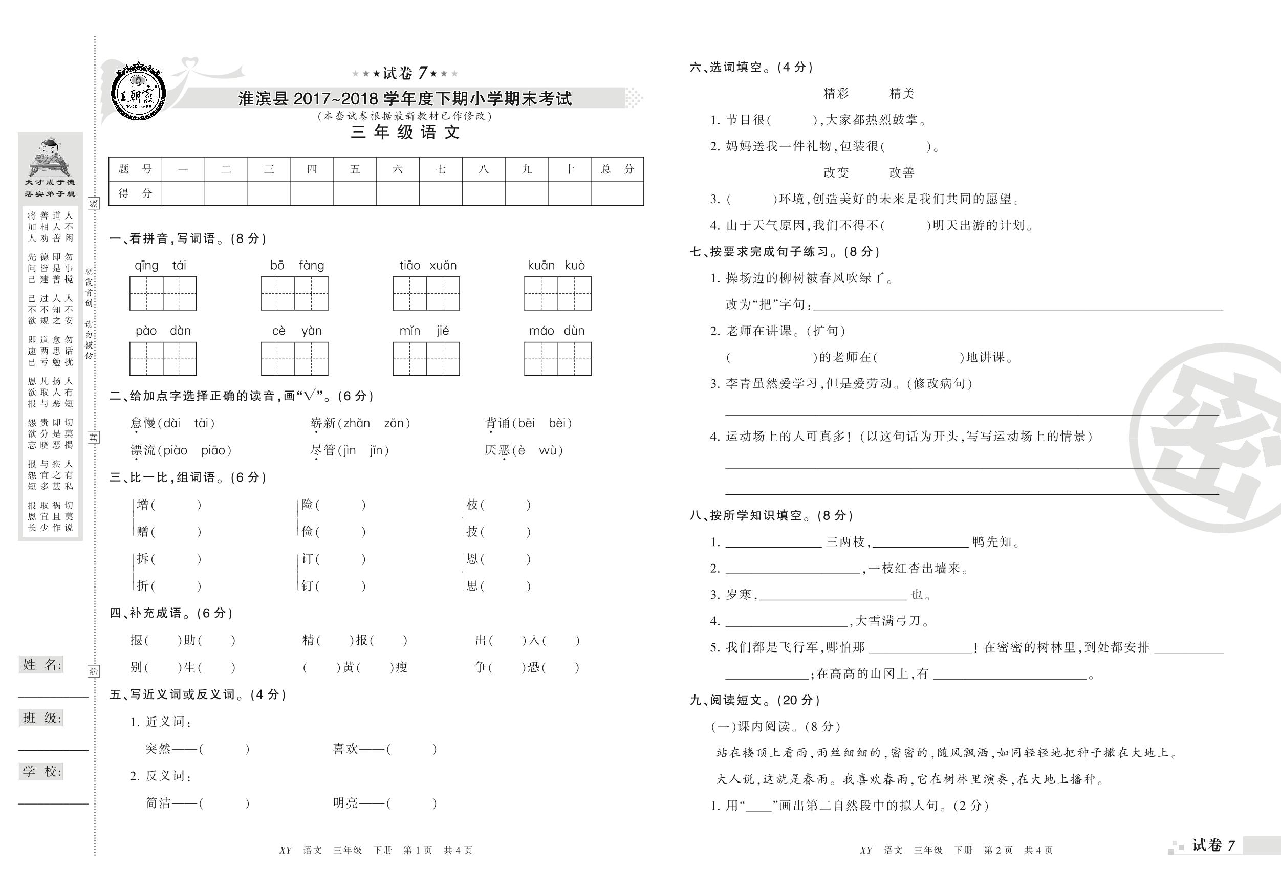 2017-2018学年第二学期信阳市淮滨县三年级语文试卷(语文版)【7】