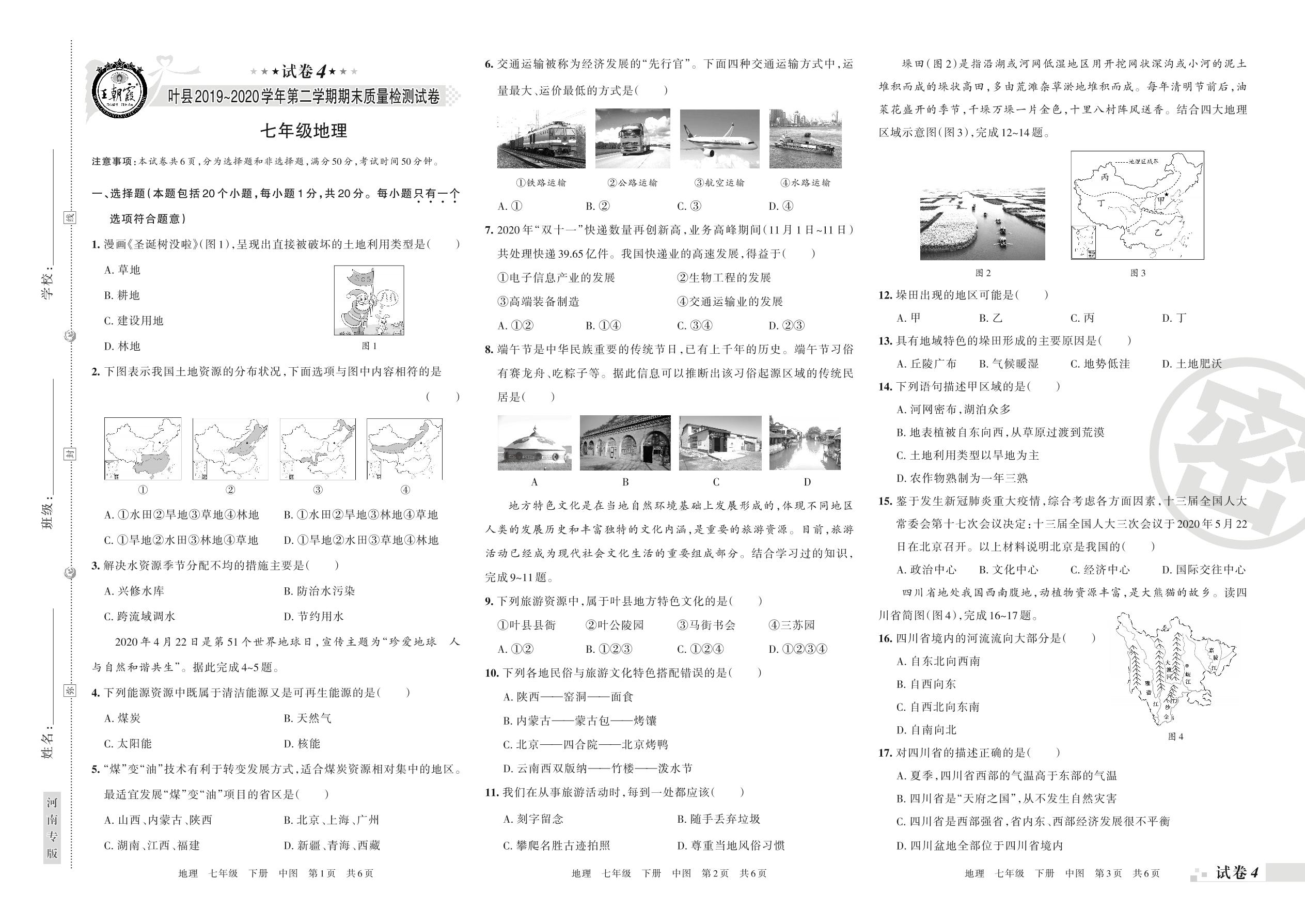 2019-2020学年第二学期平顶山市叶县七年级地理试卷(中图版)【4】