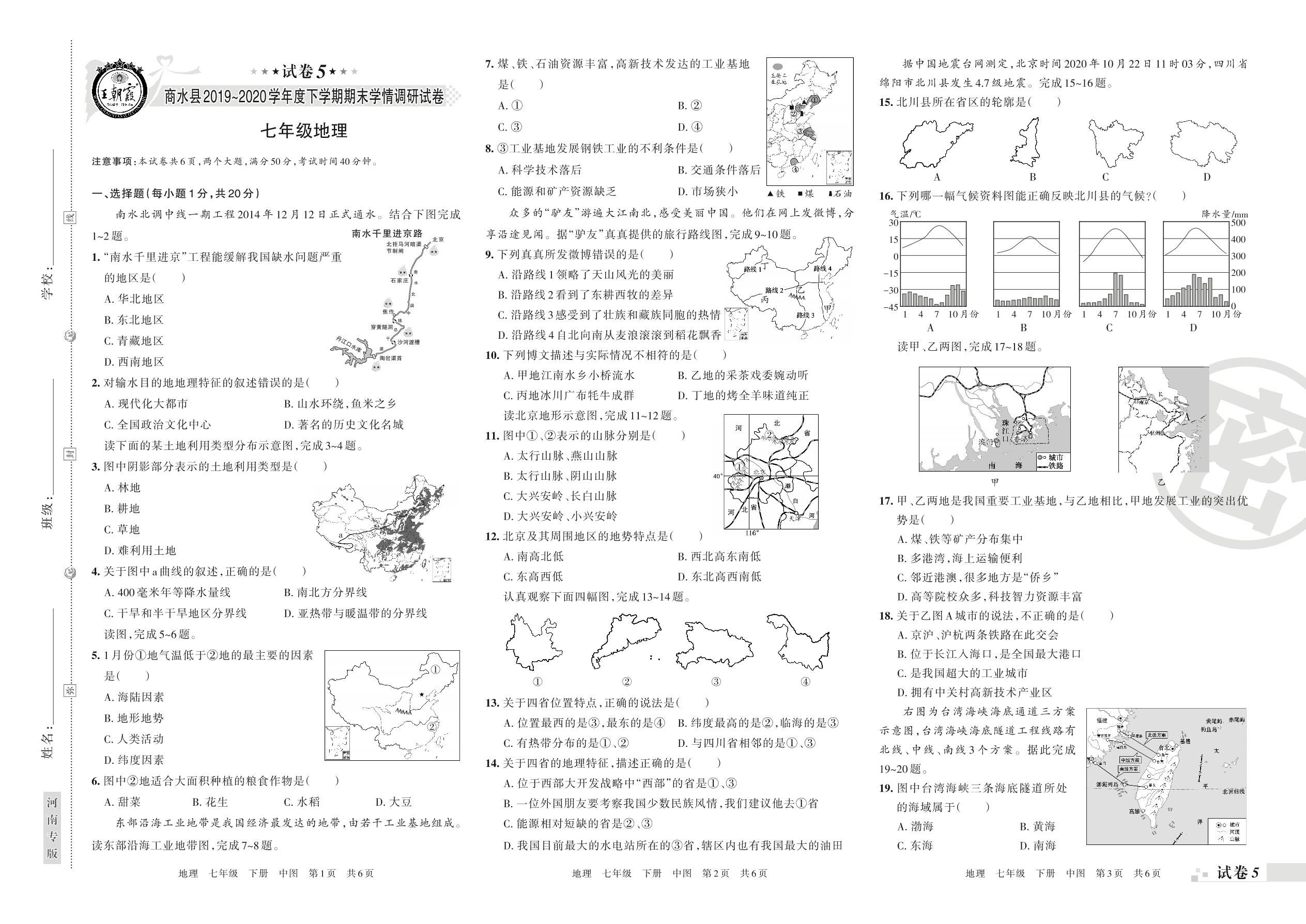 2019-2020学年第二学期周口市商水县七年级地理试卷(中图版)【5】