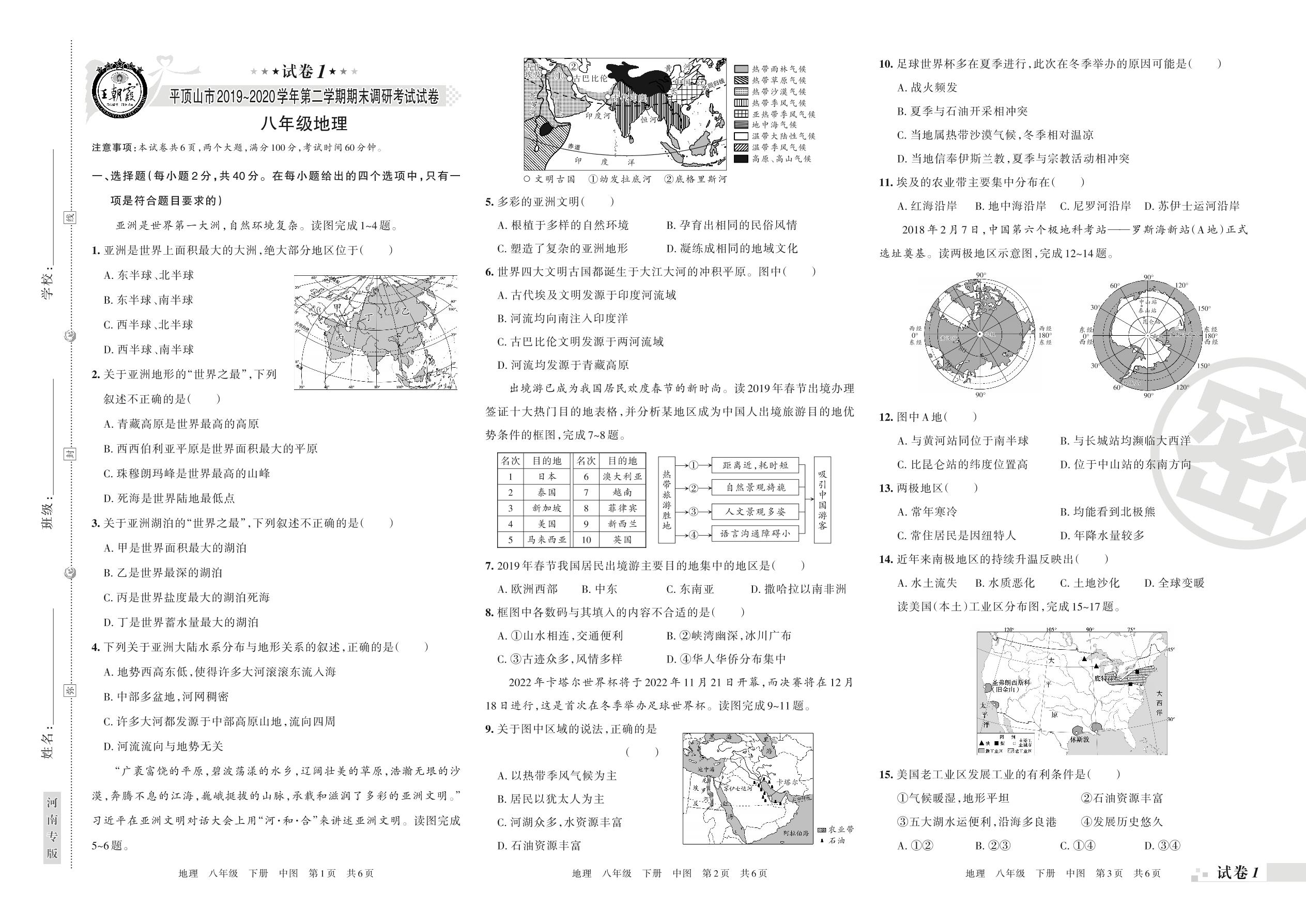 2019-2020学年第二学期平顶山市八年级地理试卷(中图版)【1】