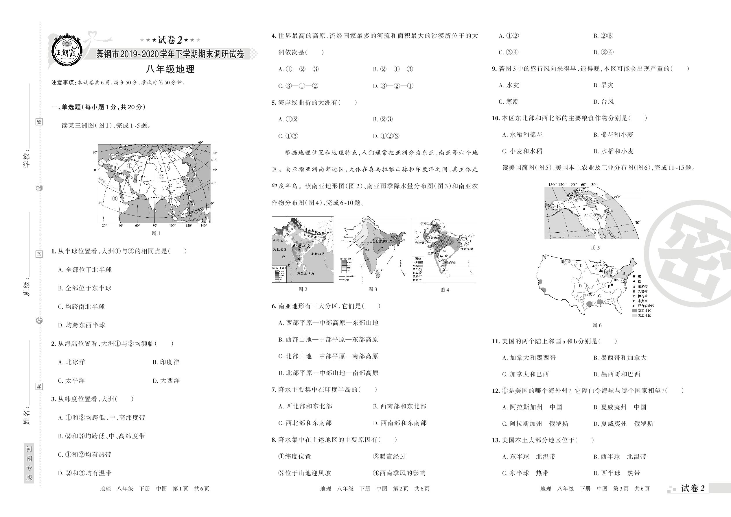 2019-2020学年第二学期舞钢市八年级地理试卷(中图版)【2】