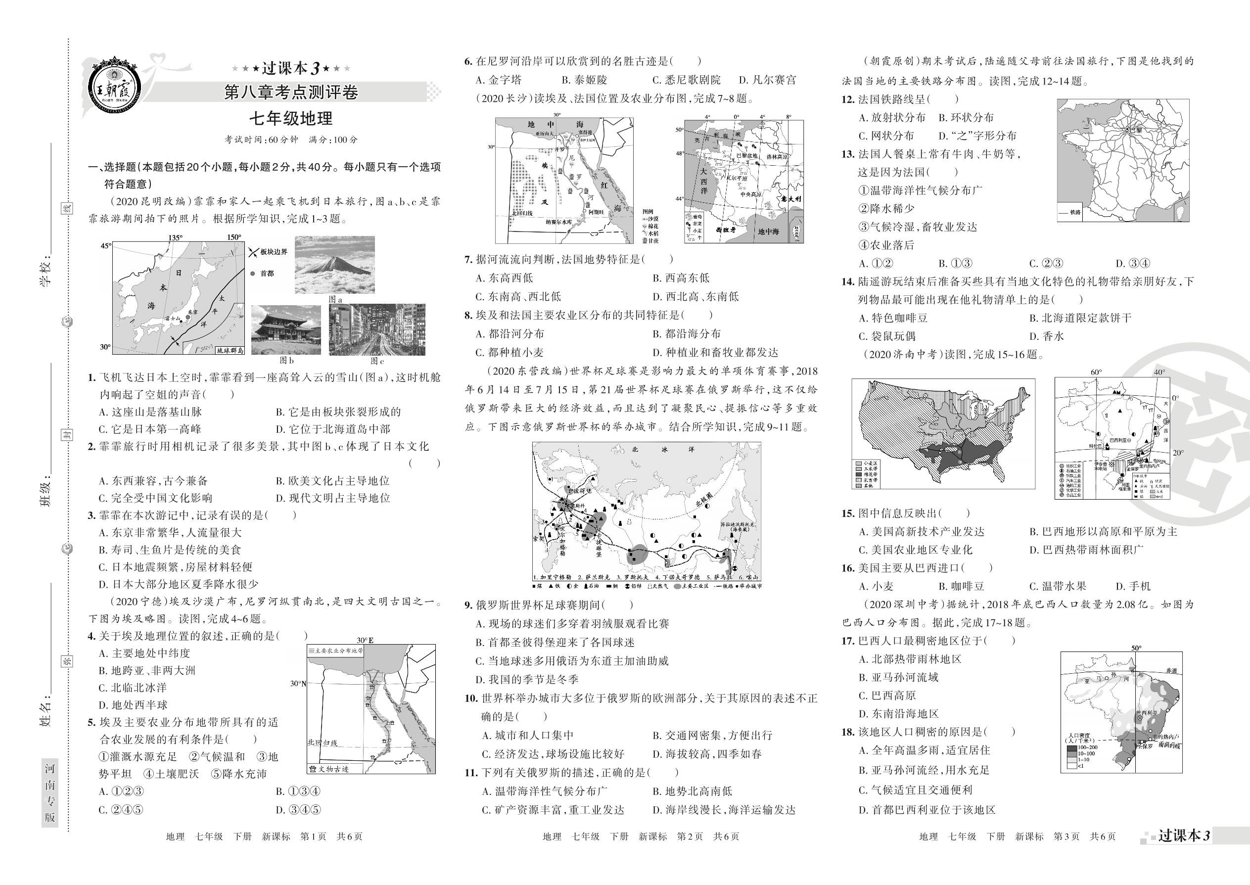 王朝霞期末过课本——第八章考点测评卷七年级下册地理(新课版)【0】