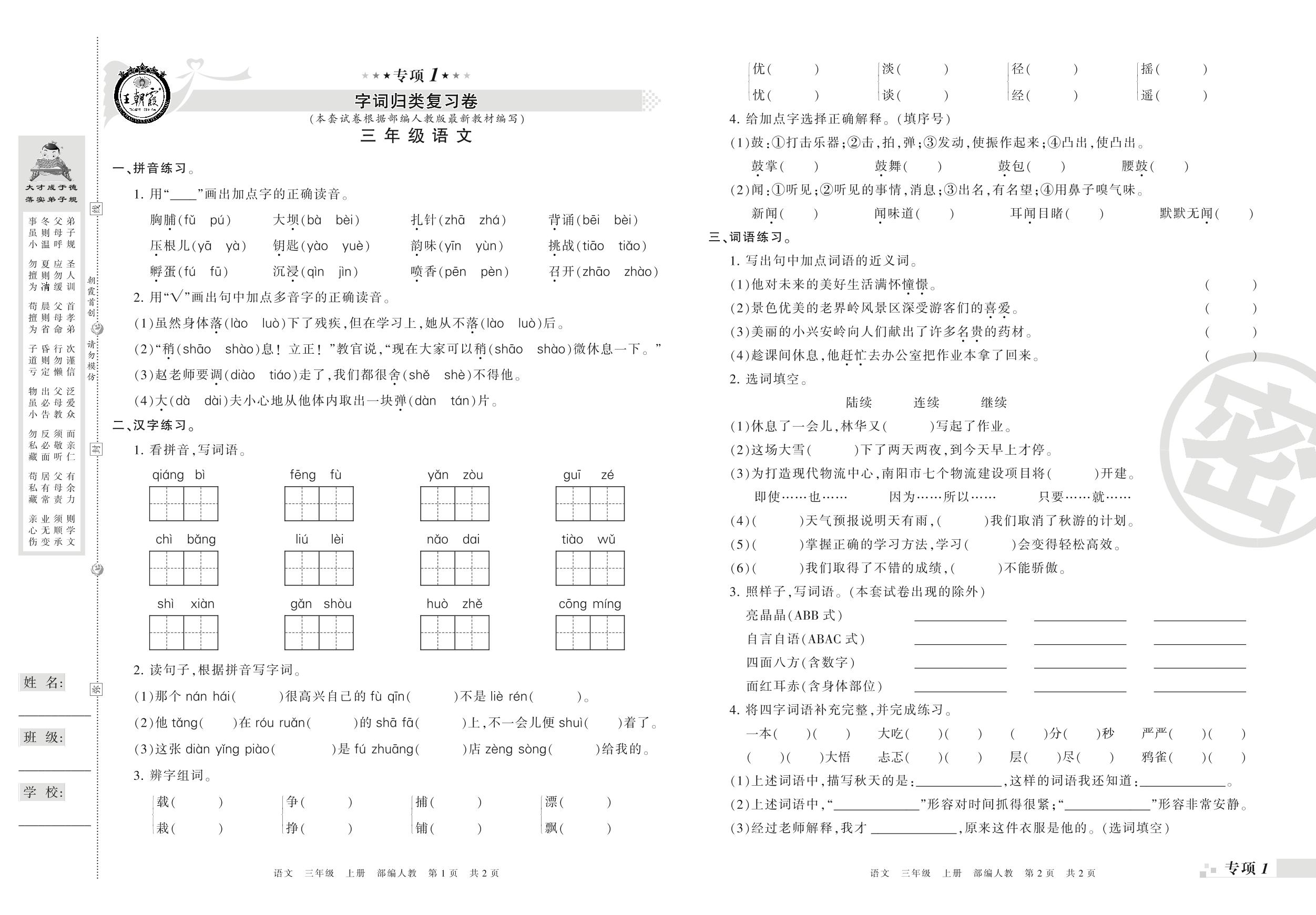 王朝霞期末专项卷——字词、句子与口语交际真题归类复习卷三年级上册语文(人教版)_R21080192644【0】