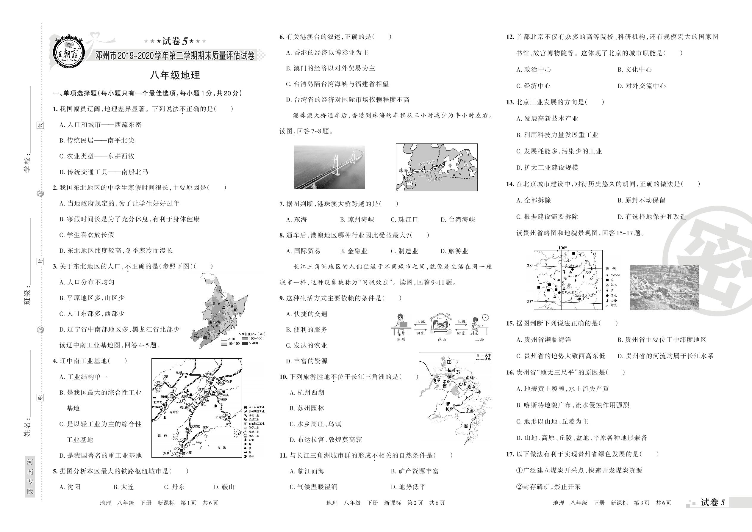 2019-2020学年第二学期邓州市八年级地理试卷(新课版)【5】