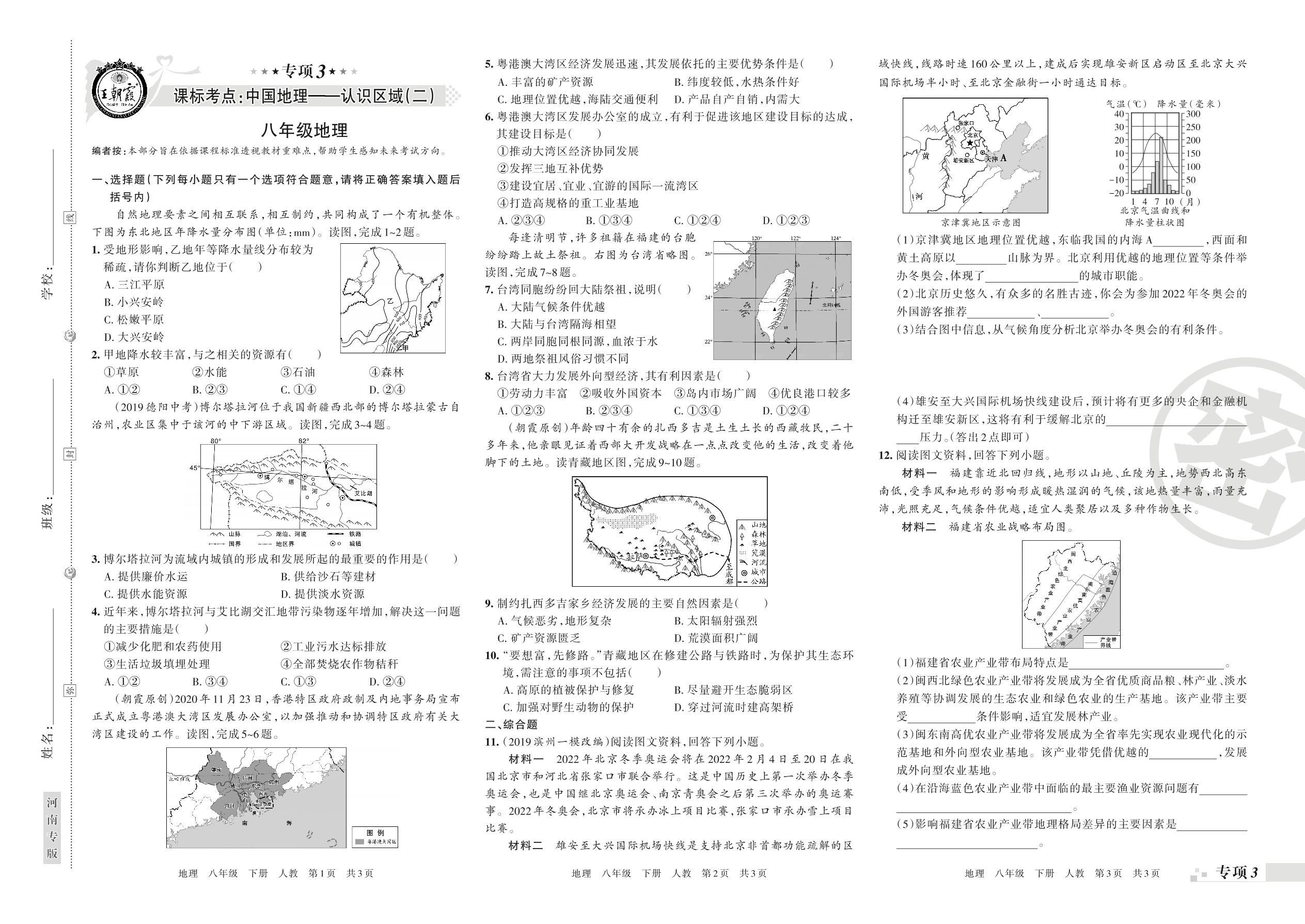 王朝霞期末专项卷——认识区域(二)、河南乡土地理八年级下册地理(人教版)【0】