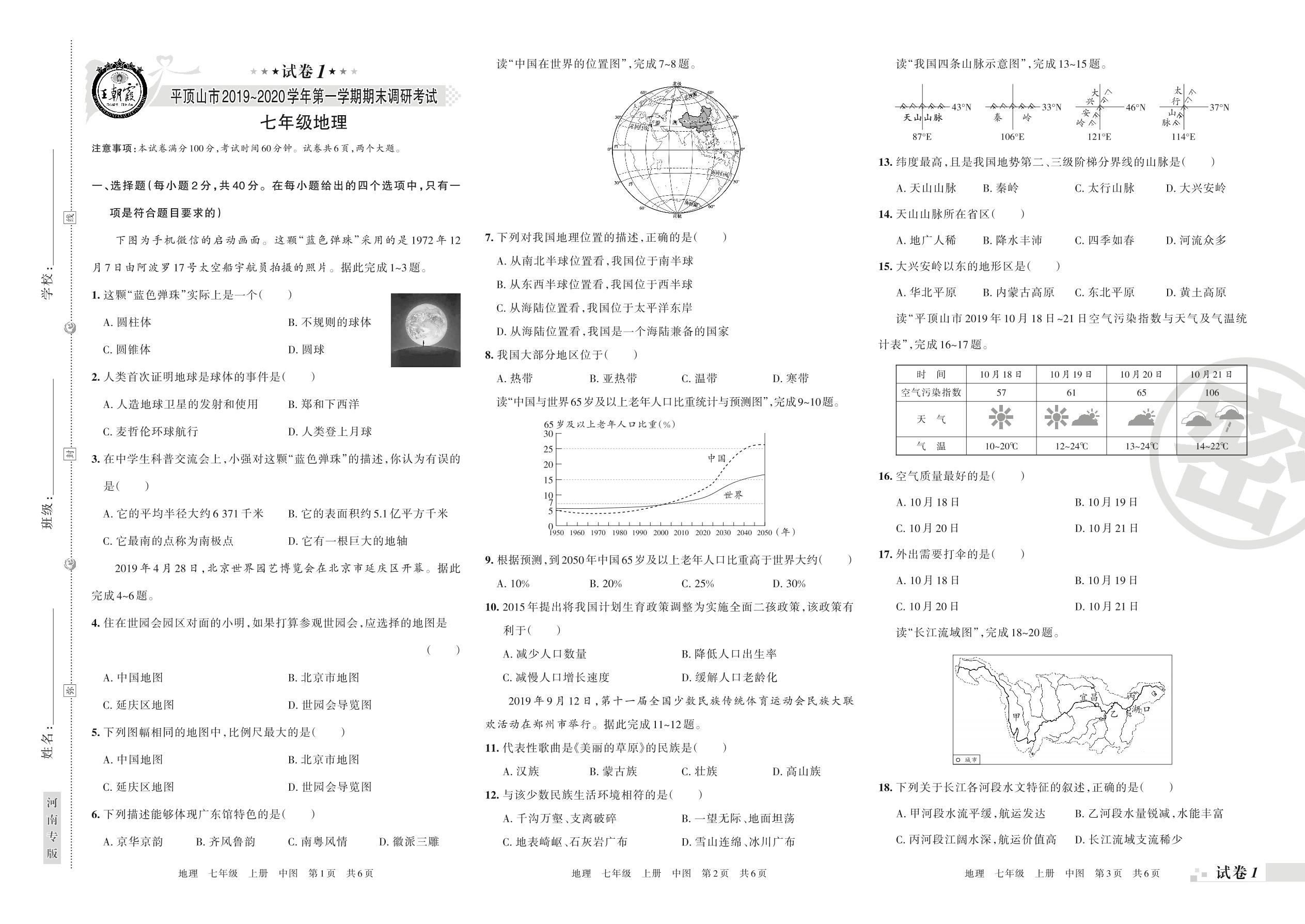 2019-2020学年第一学期平顶山市七年级地理试卷(中图版)【1】