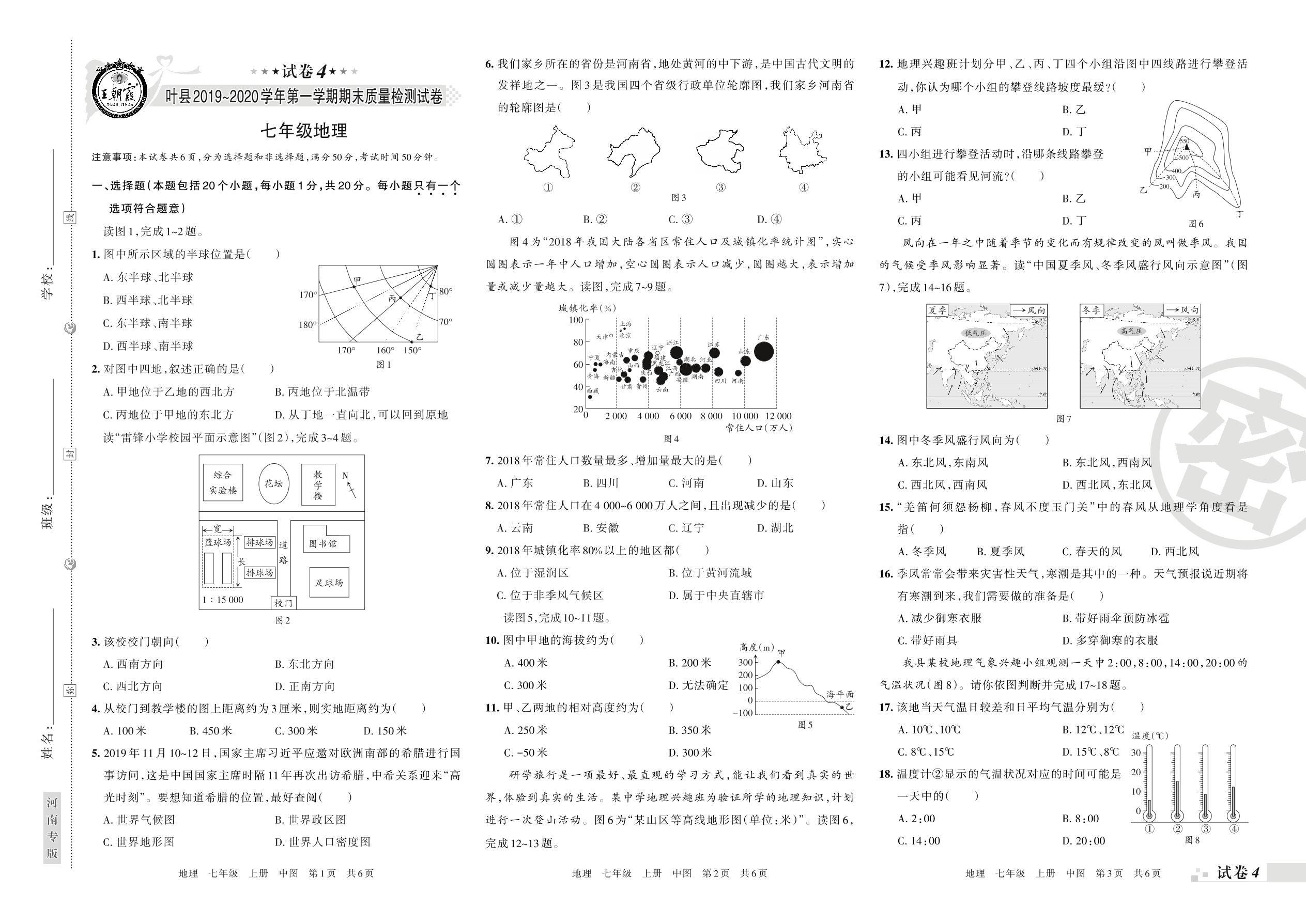2019-2020学年第一学期平顶山市叶县七年级地理试卷(中图版)【4】