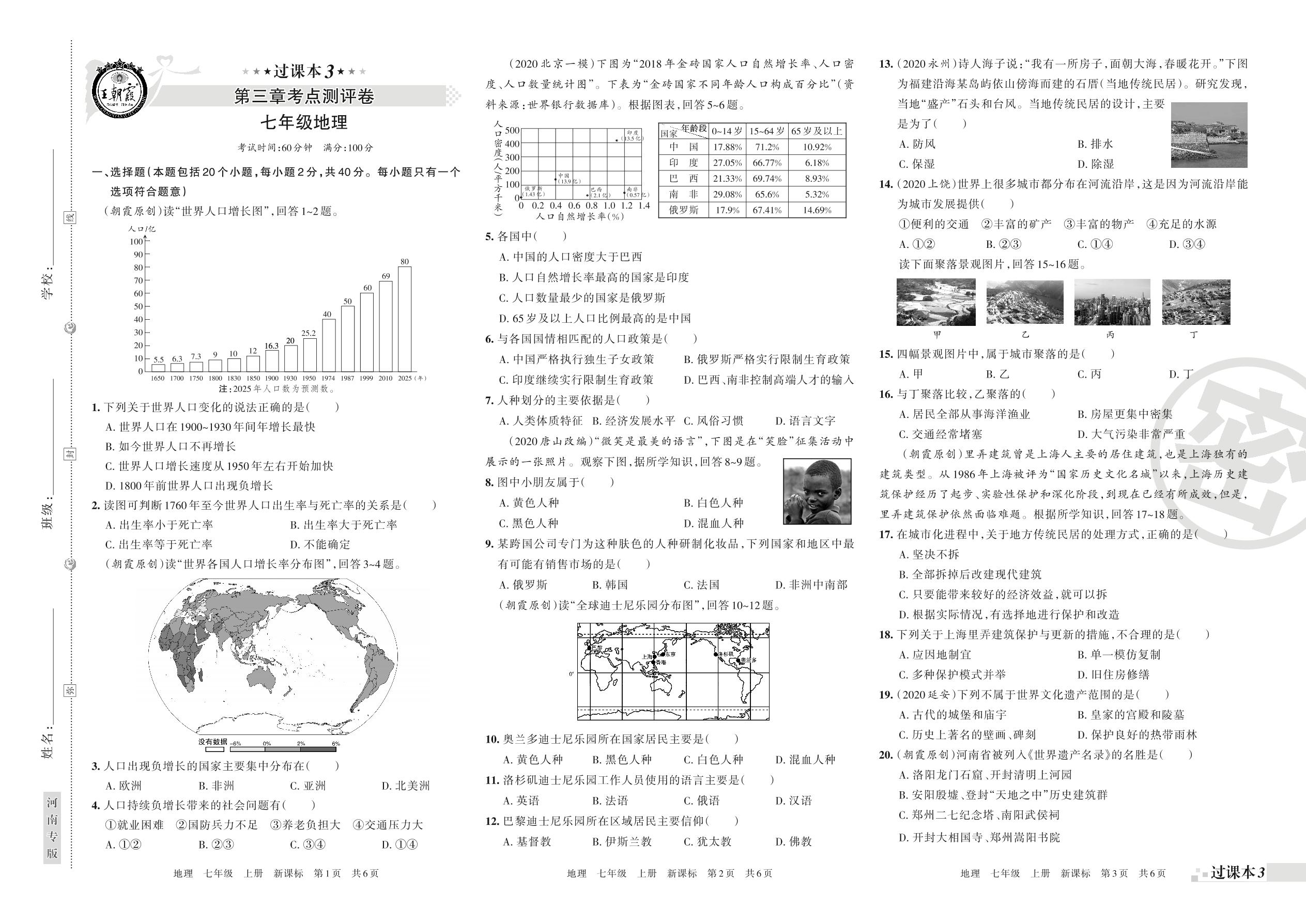 王朝霞期末过课本——第三章考点测评七年级上册地理(湘教版)【0】