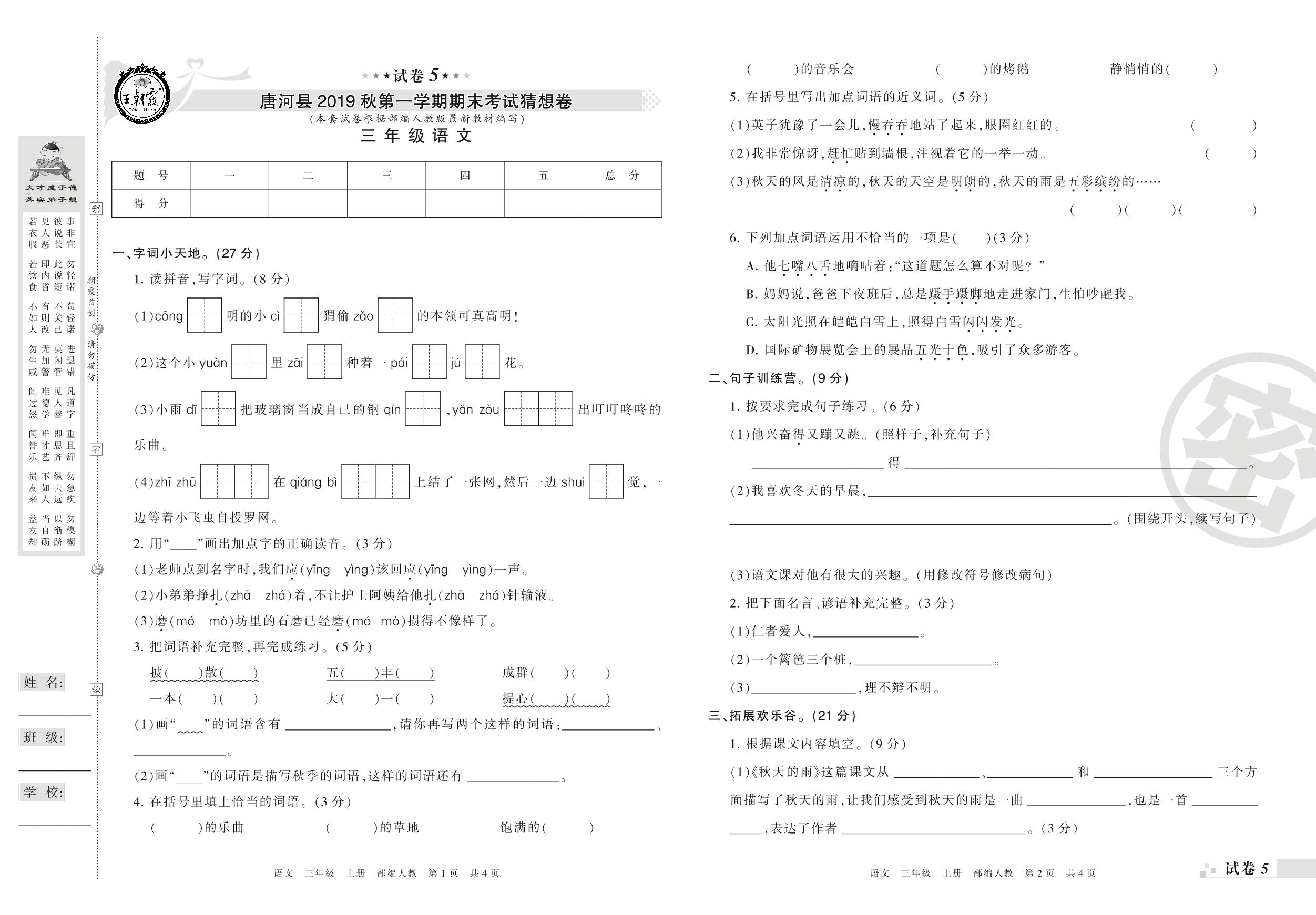 2018-2019学年第一学期南阳市唐河县猜想卷三年级语文试卷(人教版)【5】