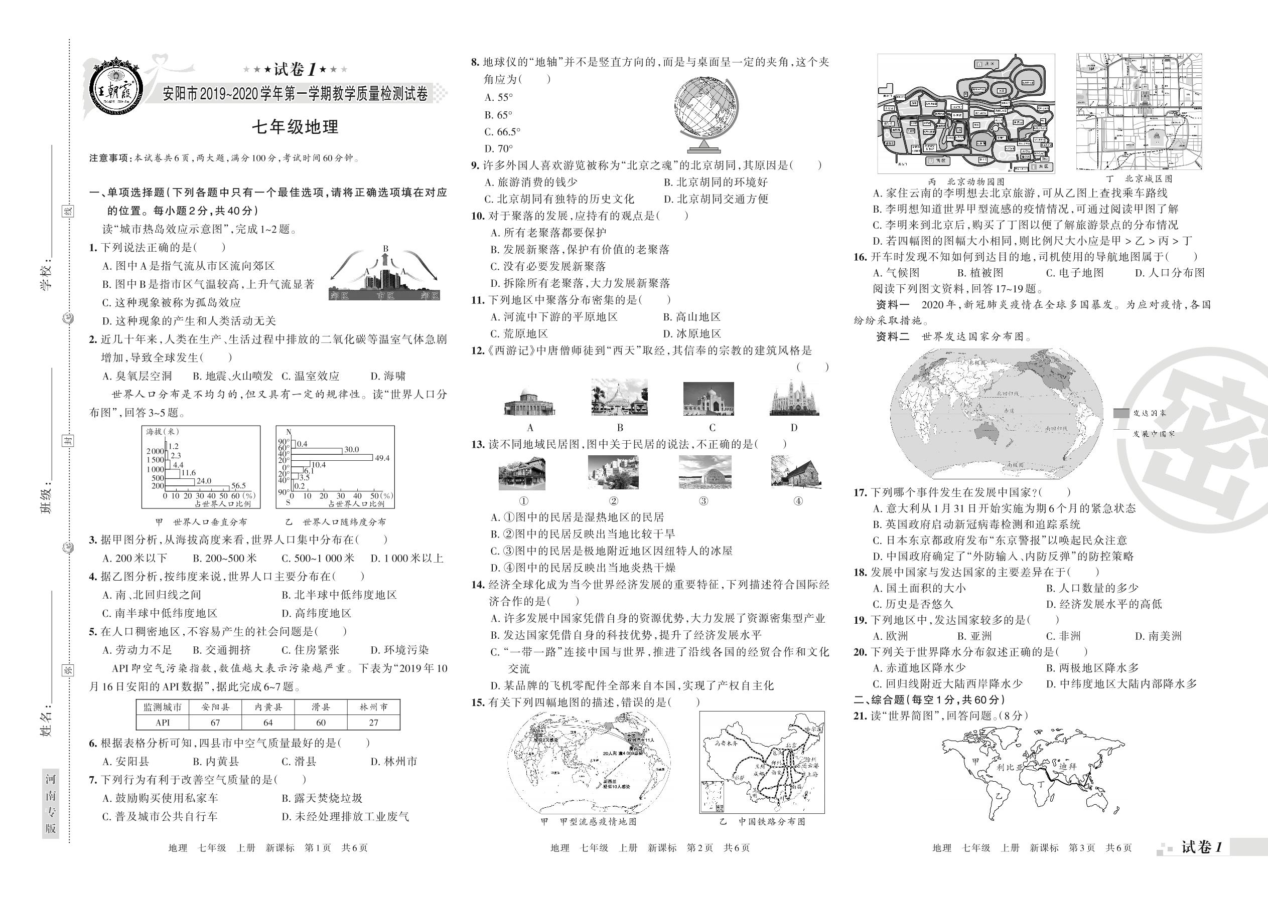 2019-2020学年第一学期安阳市七年级地理试卷(湘教版)【1】