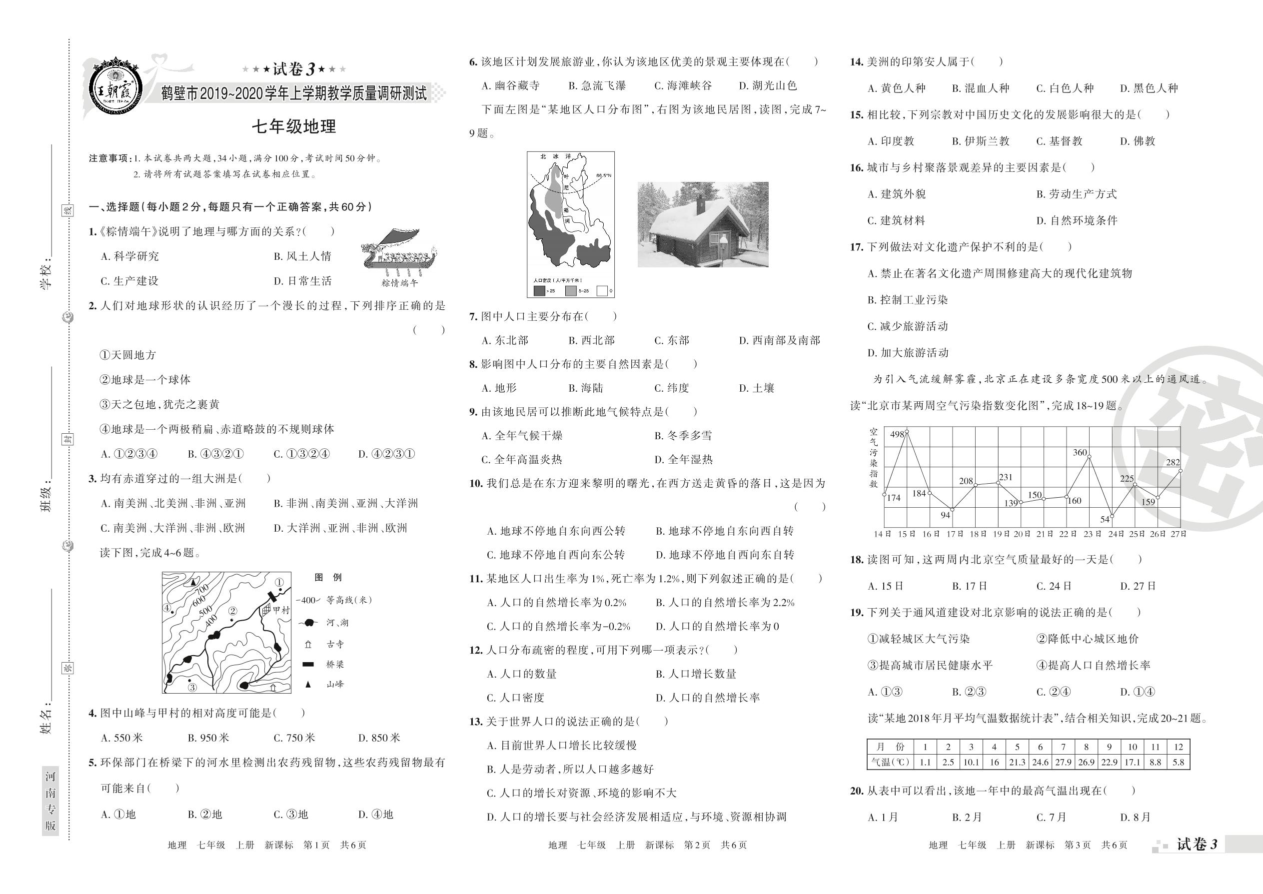 2019-2020学年第一学期鹤壁市七年级地理试卷(湘教版)【3】