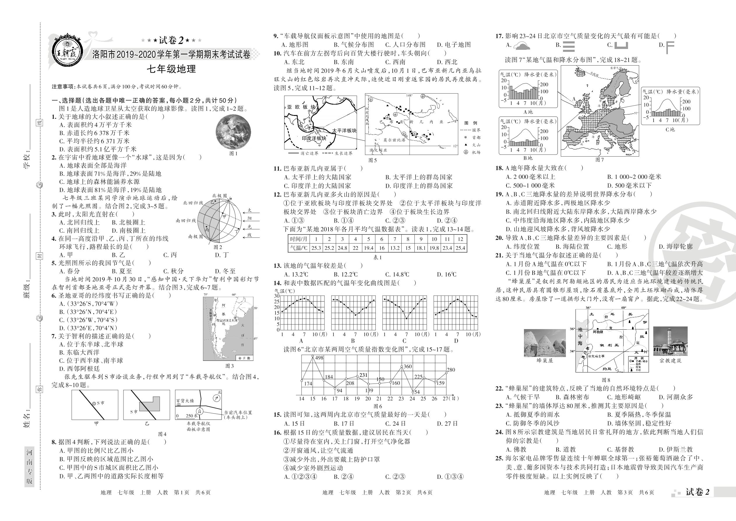 2019-2020学年第一学期洛阳市七年级地理试卷(人教版)【2】