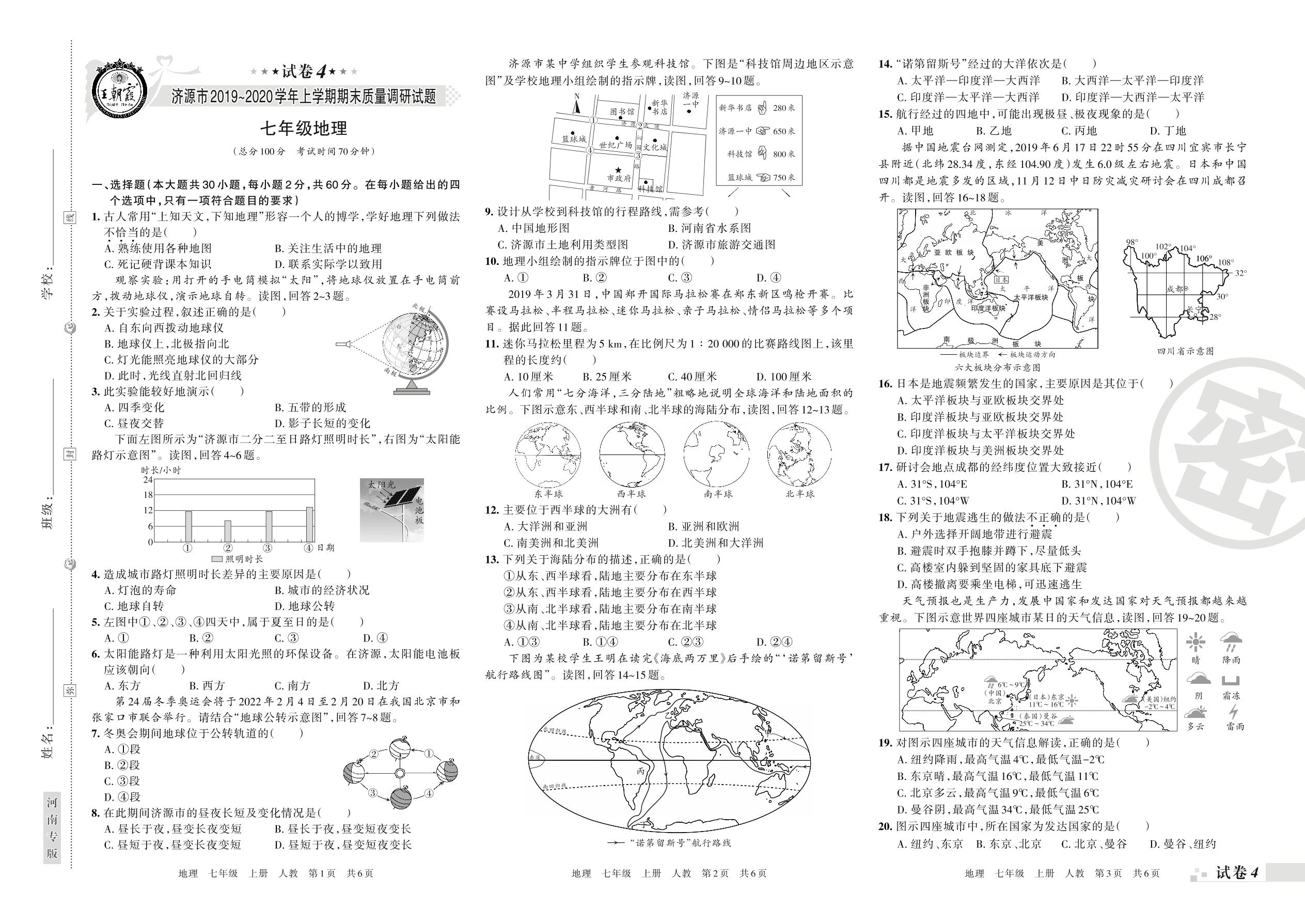 2019-2020学年第一学期济源市七年级地理试卷(人教版)【4】