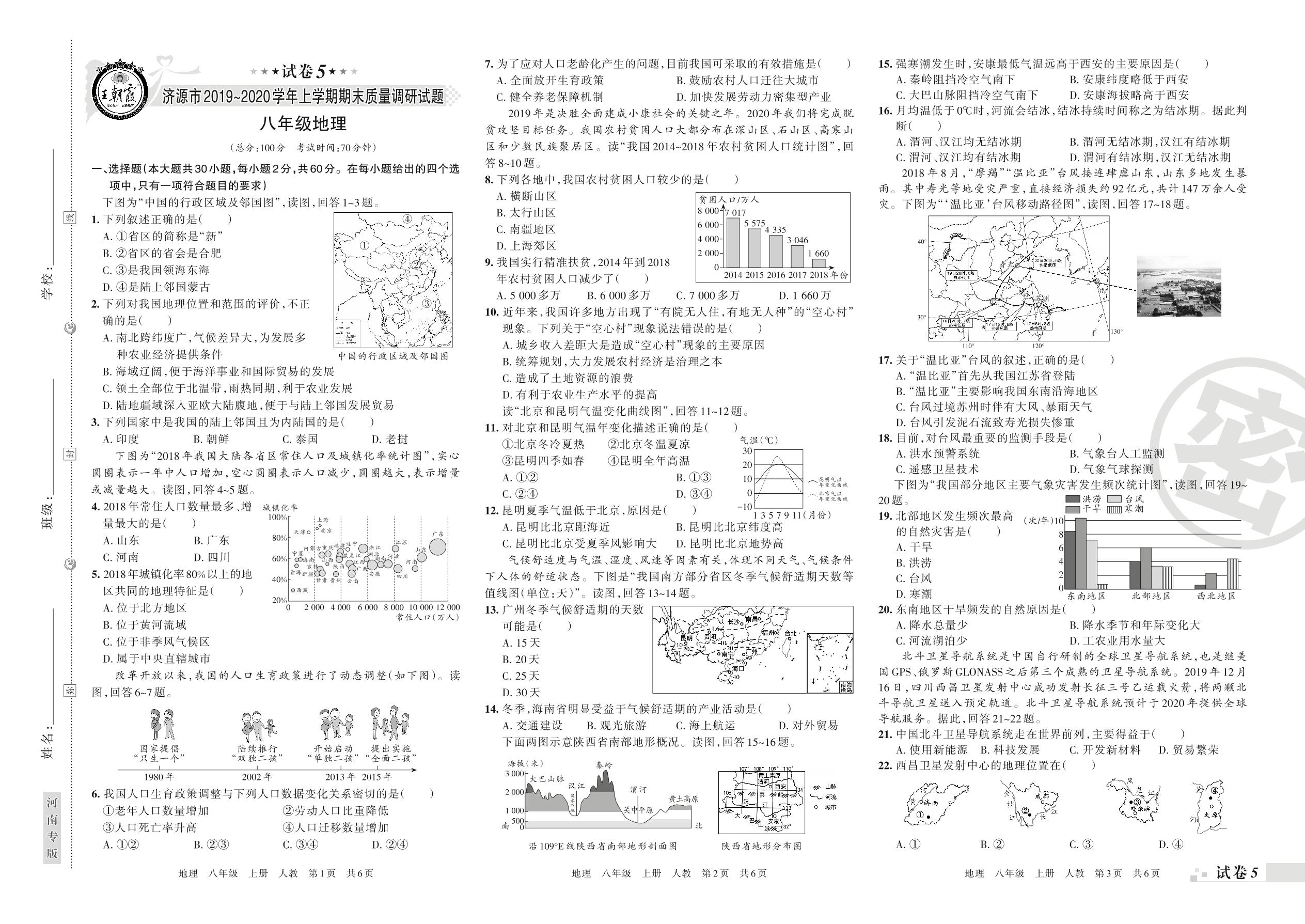 2019-2020学年第一学期济源市八年级地理试卷(人教版)【5】