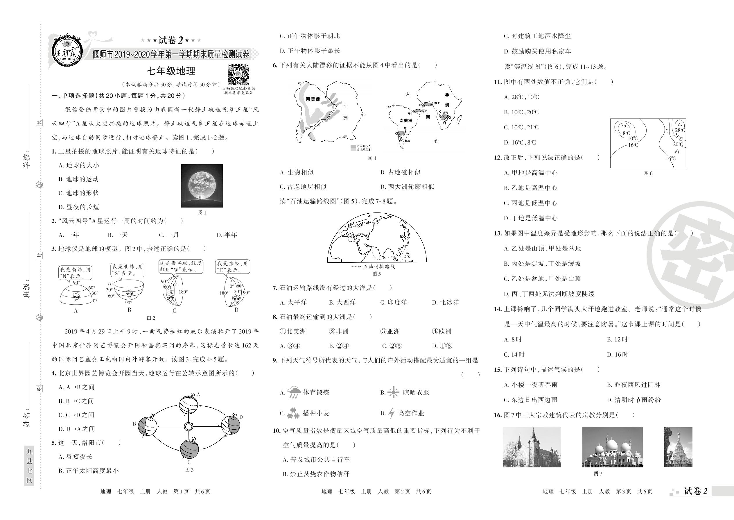 2019-2020学年第一学期偃师市七年级地理试卷(人教版)【2】