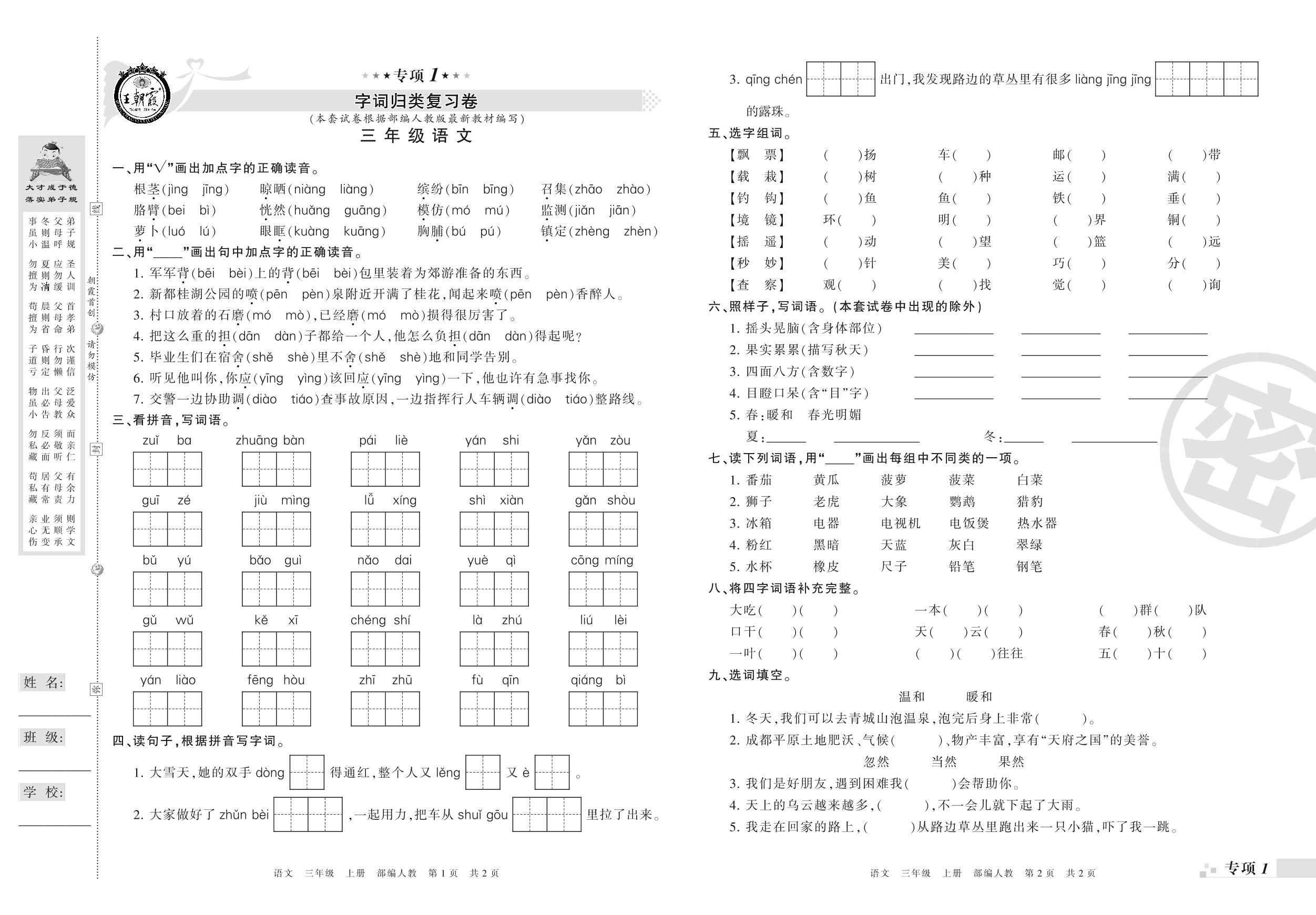 王朝霞期末专项卷——字词、句子与口语交际真题归类复习卷三年级上册语文(人教版)_R21080192726【0】