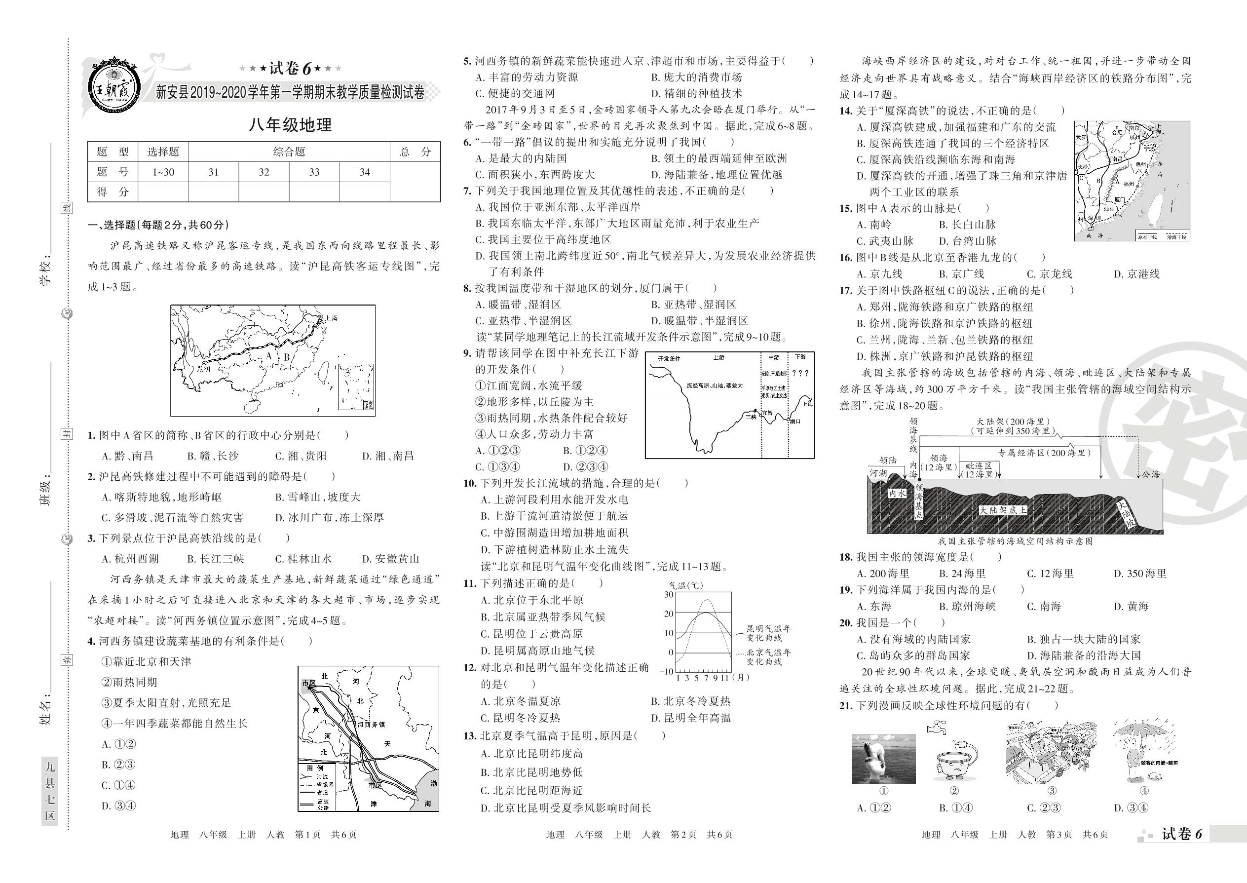 2019-2020学年第一学期洛阳市新安县八年级地理试卷(人教版)【6】