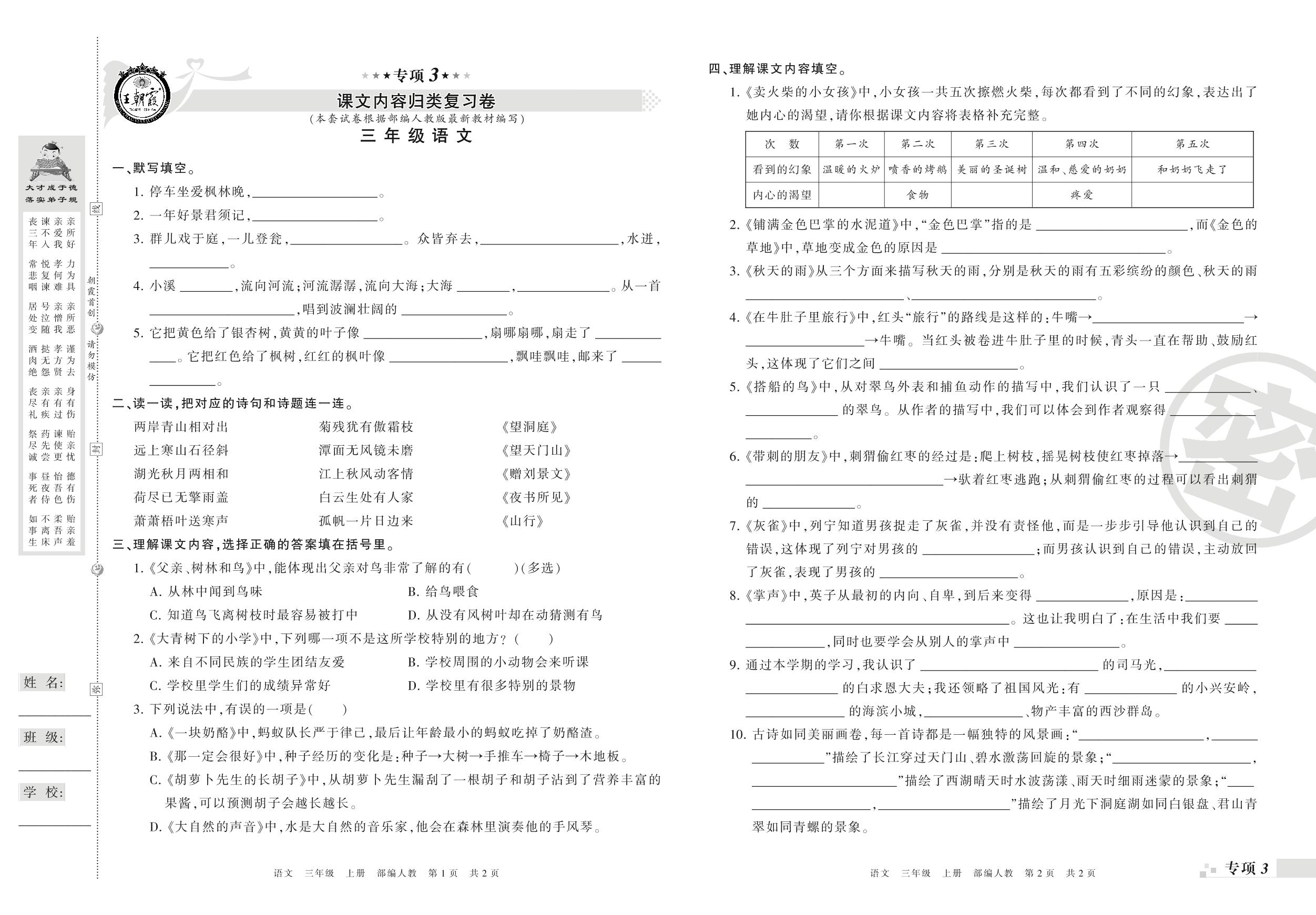 王朝霞期末专项卷——课文内容、积累运用真题归类复习卷三年级上册语文(人教版)_R21080192729【0】