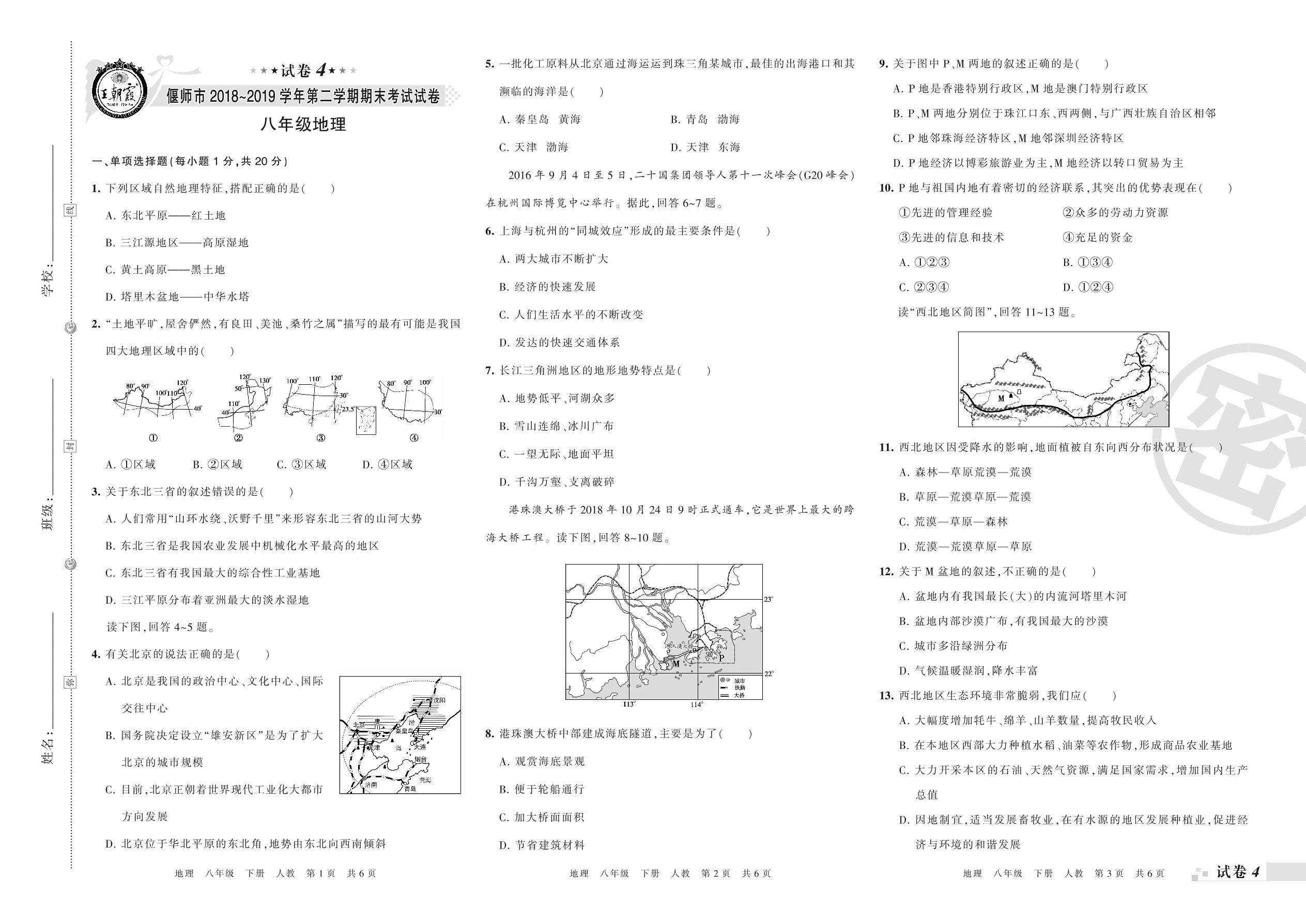 2018-2019学年第二学期偃师市八年级地理试卷(人教版)【4】