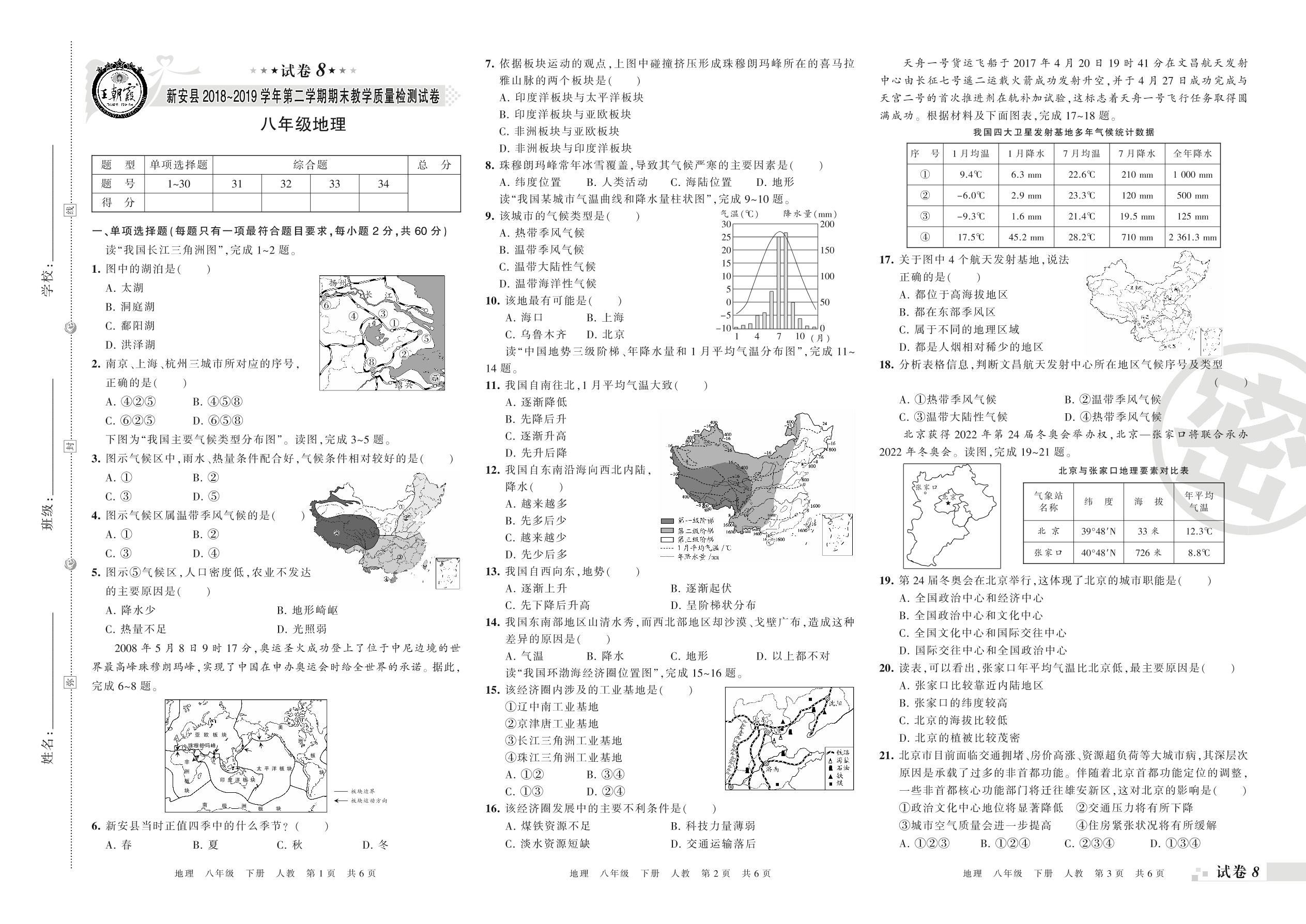 2018-2019学年第二学期洛阳市新安县八年级地理试卷(人教版)【8】