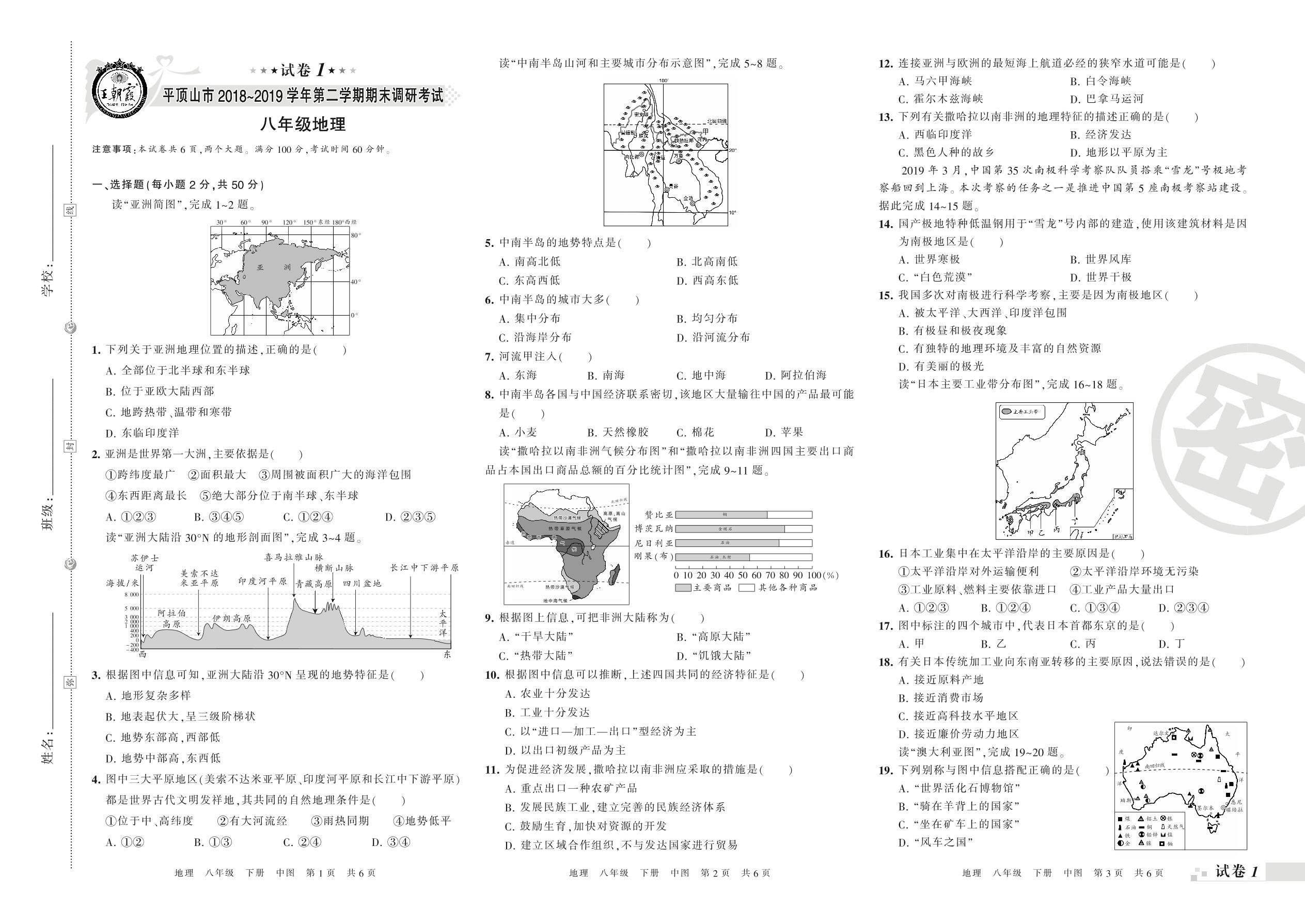 2018-2019学年第二学期平顶山市八年级地理试卷(中图版)【1】
