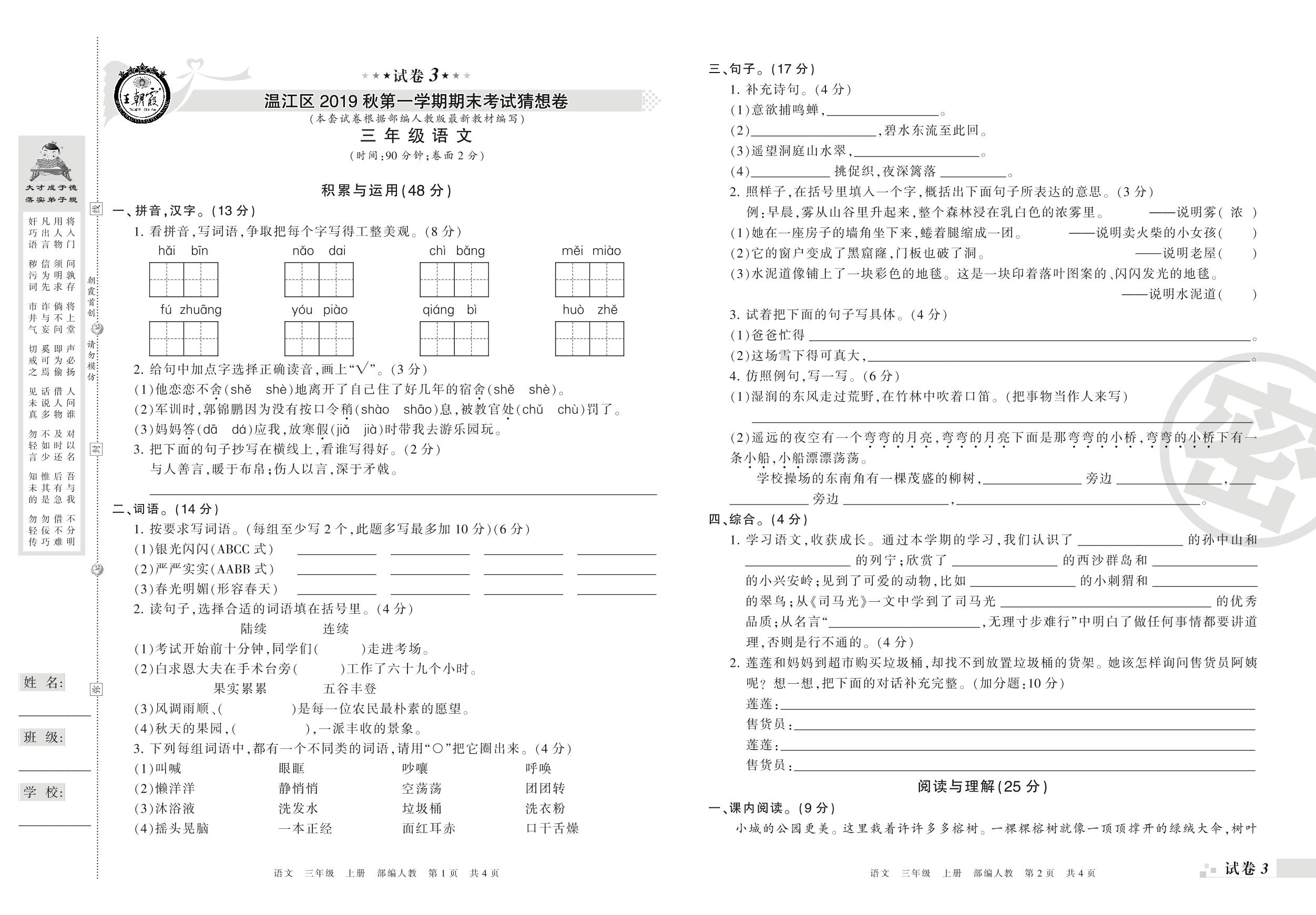 2018-2019学年第一学期成都市温江区猜想卷三年级语文试卷(人教版)【3】