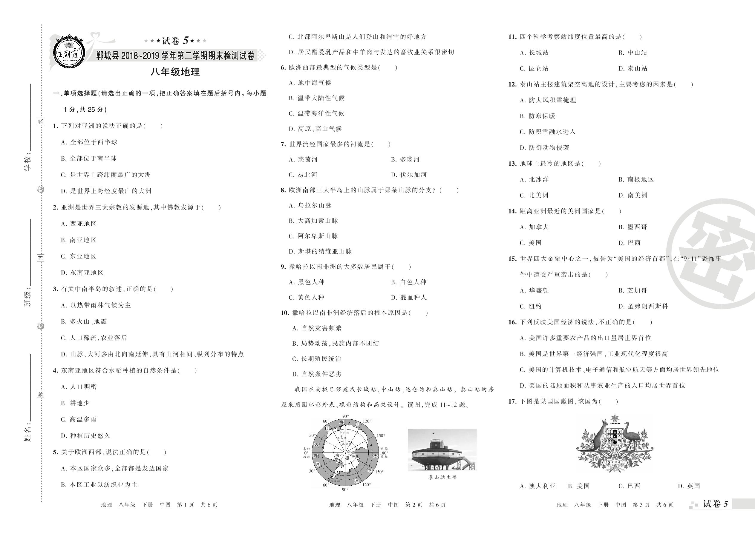 2018-2019学年第二学期周口市郸城县八年级地理试卷(中图版)【5】