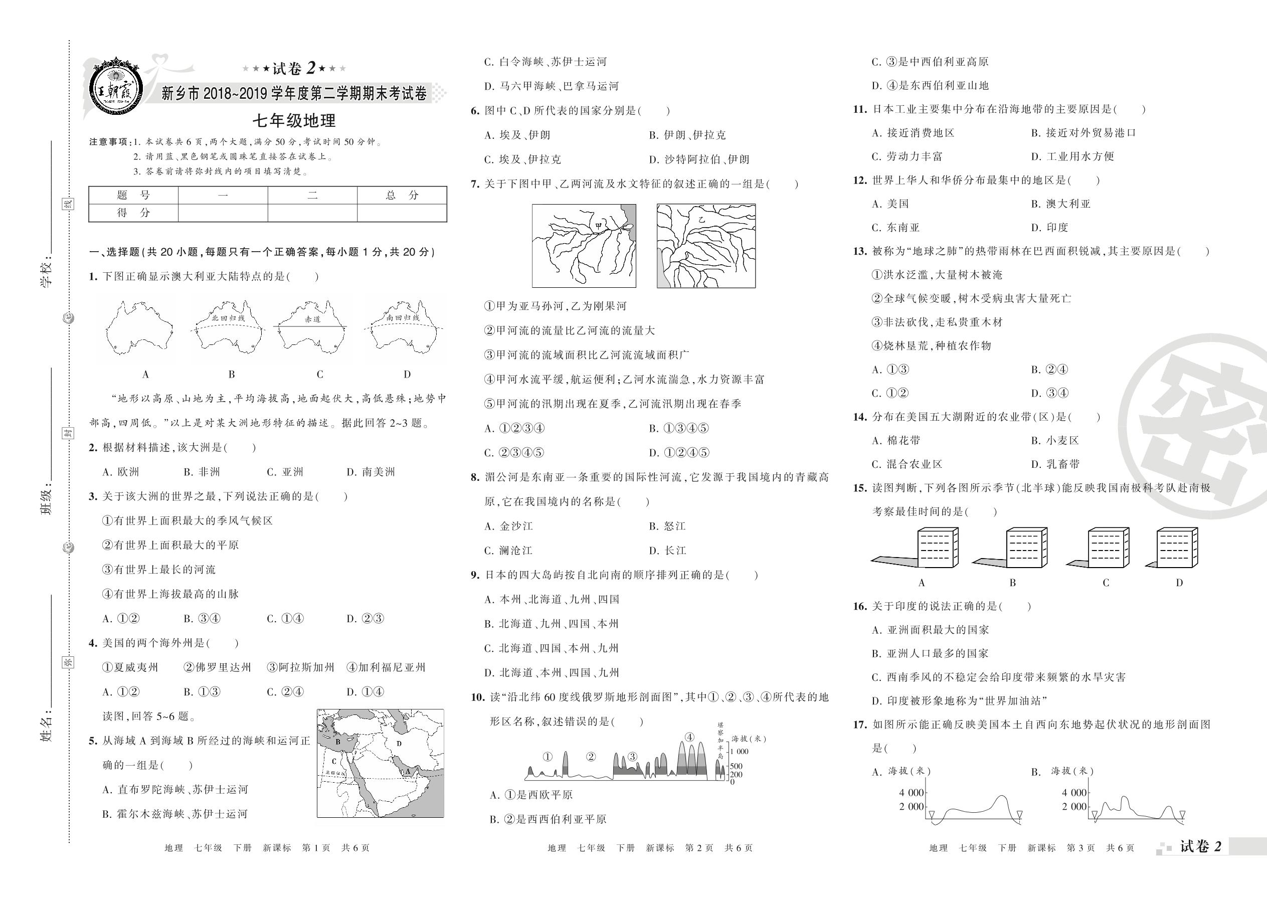 七年级地理新课标版下册期末卷