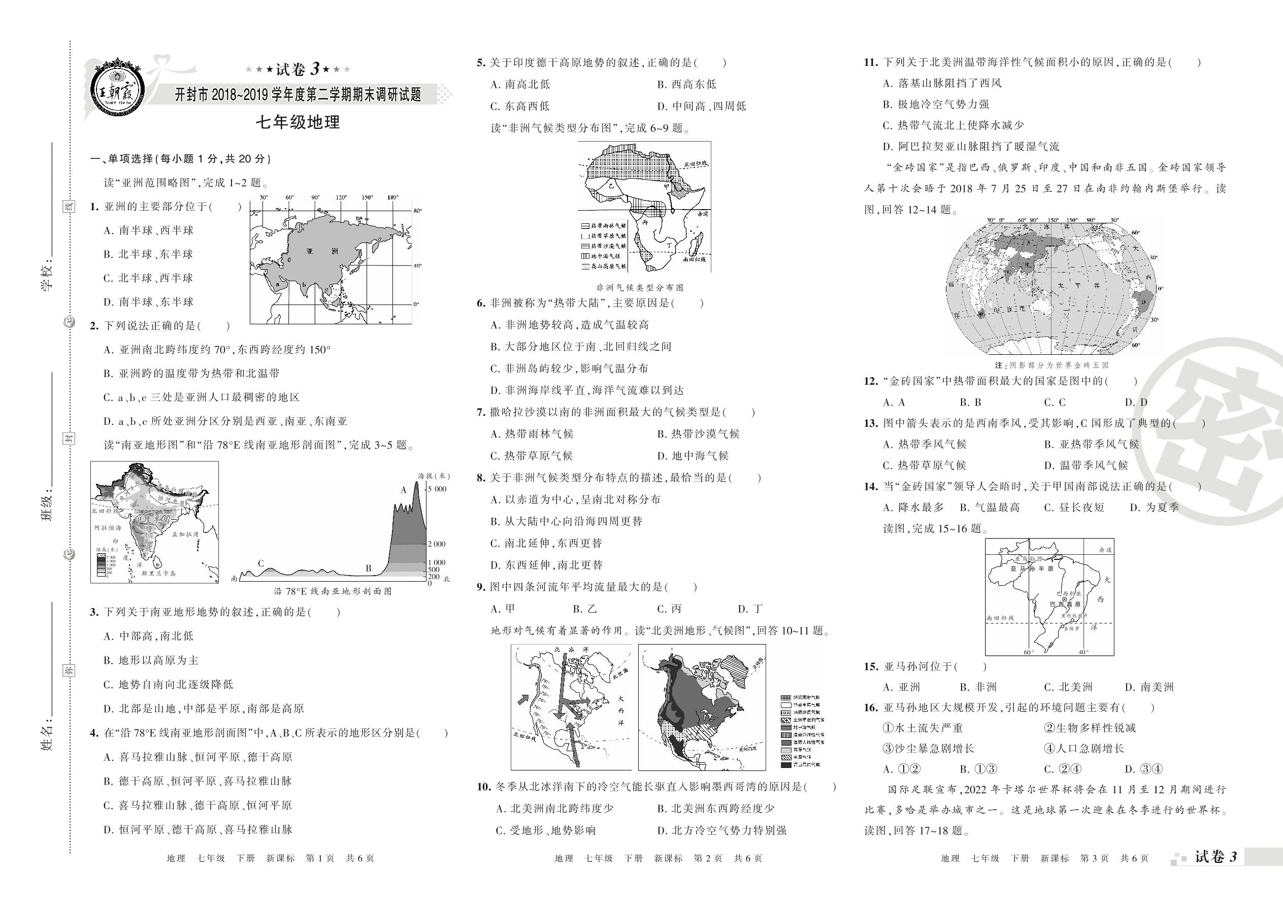 2018-2019学年第二学期开封市七年级地理试卷(新课标版)【3】