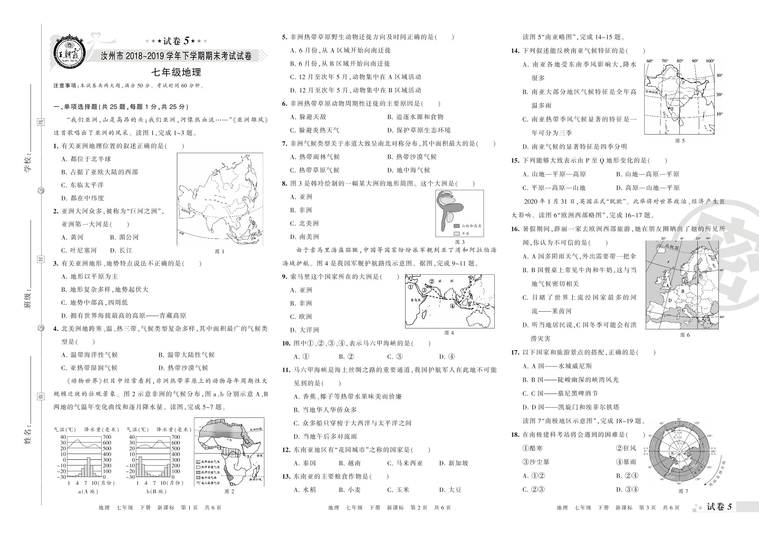 七年级地理新课标版下册期末卷
