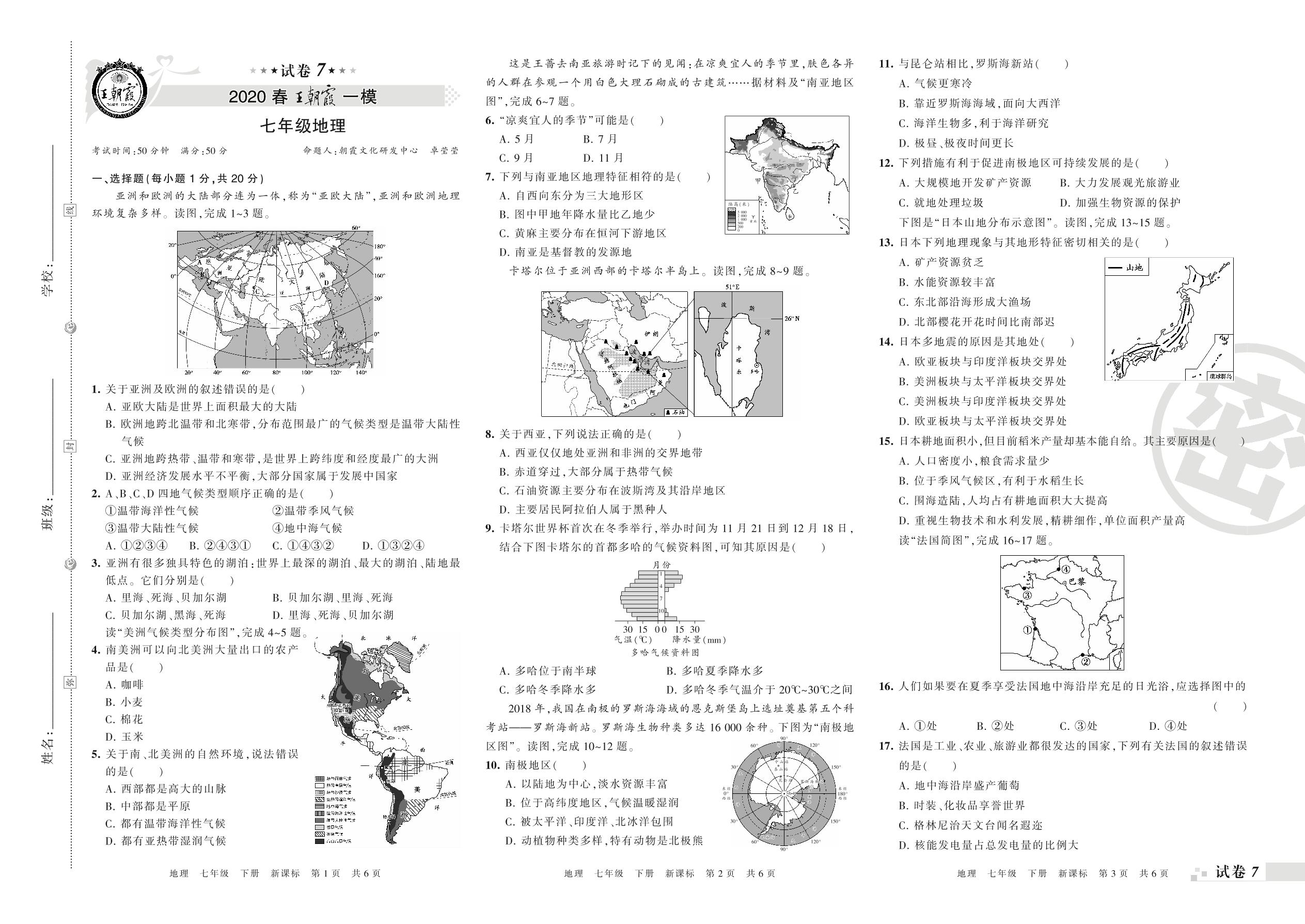 王朝霞期末模拟卷七年级下册地理(新课标版)【7】