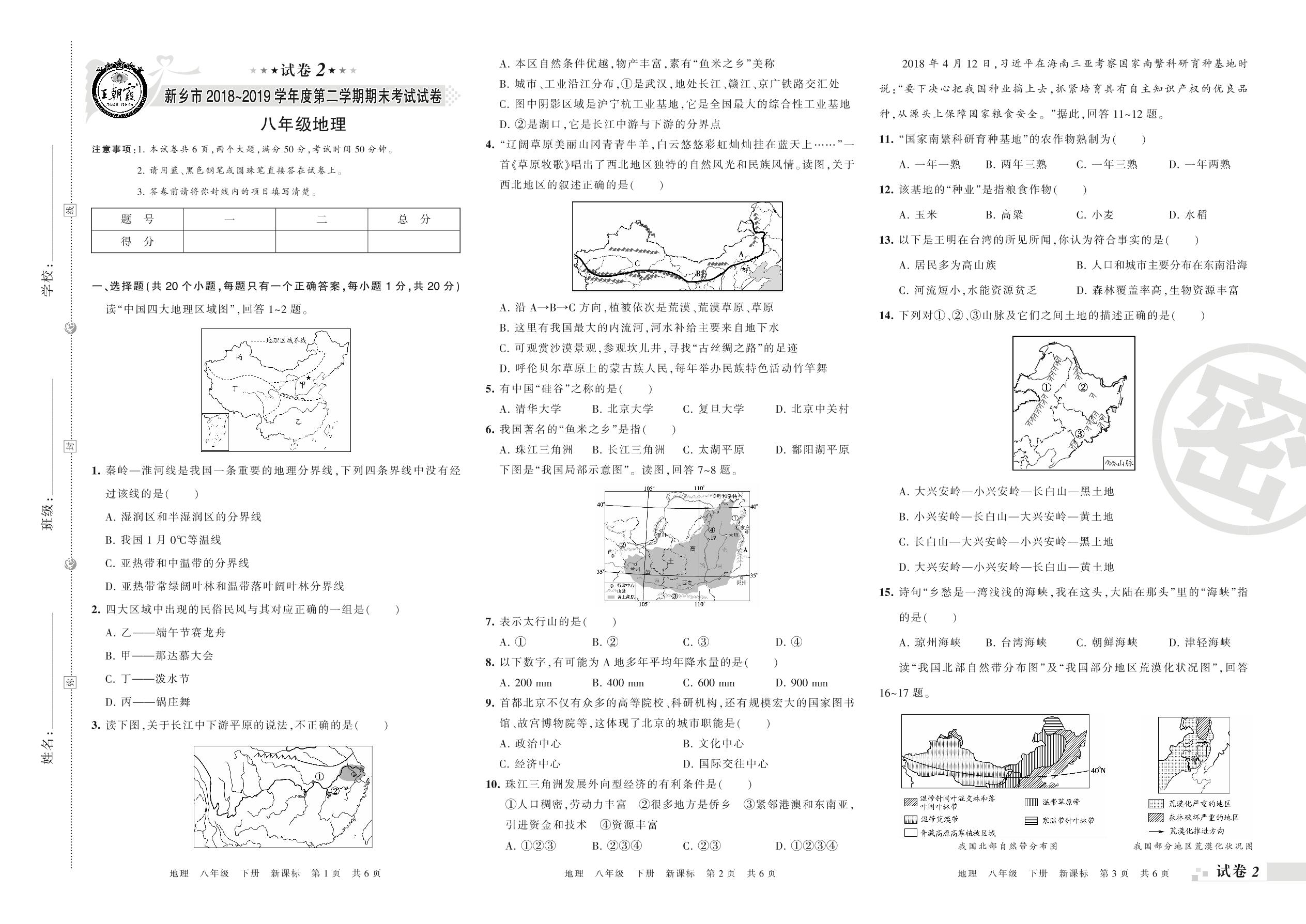 2018-2019学年第二学期新乡市八年级地理试卷(新课标版)【2】
