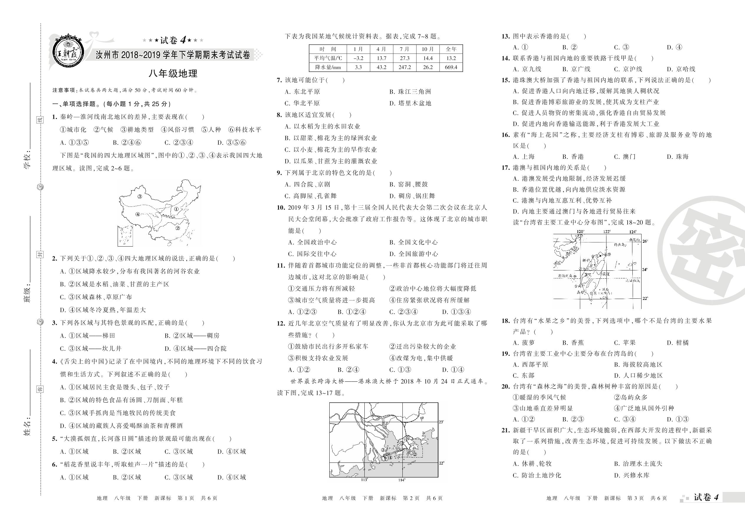 2018-2019学年第二学期汝州市八年级地理试卷(新课标版)【4】