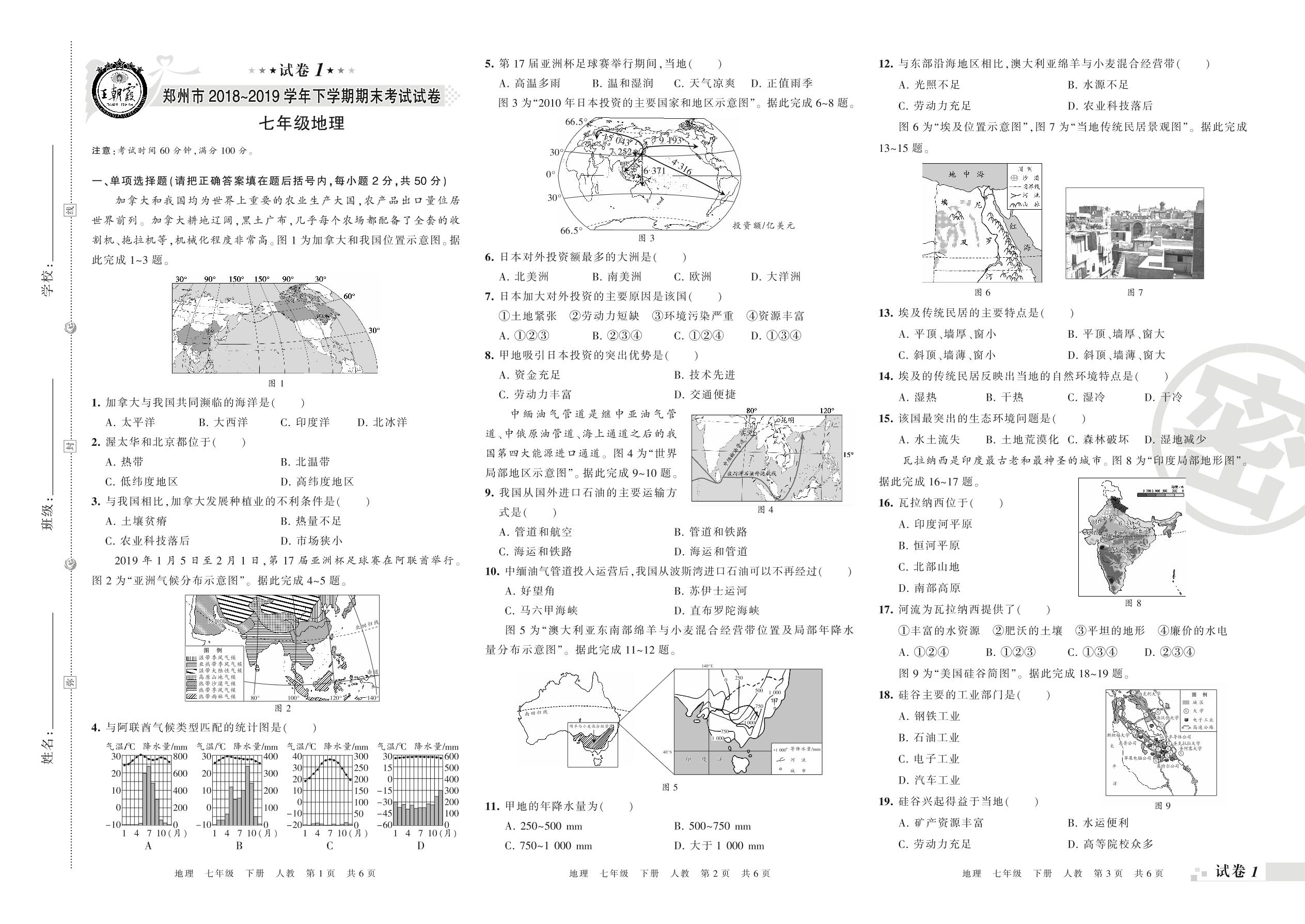 2018-2019学年第二学期郑州市七年级地理试卷(人教版)【1】