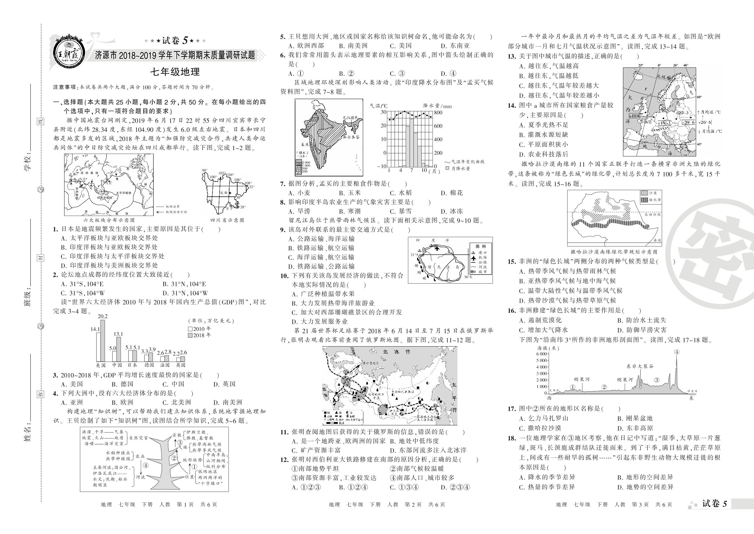 2018-2019学年第二学期济源市七年级地理试卷(人教版)【5】