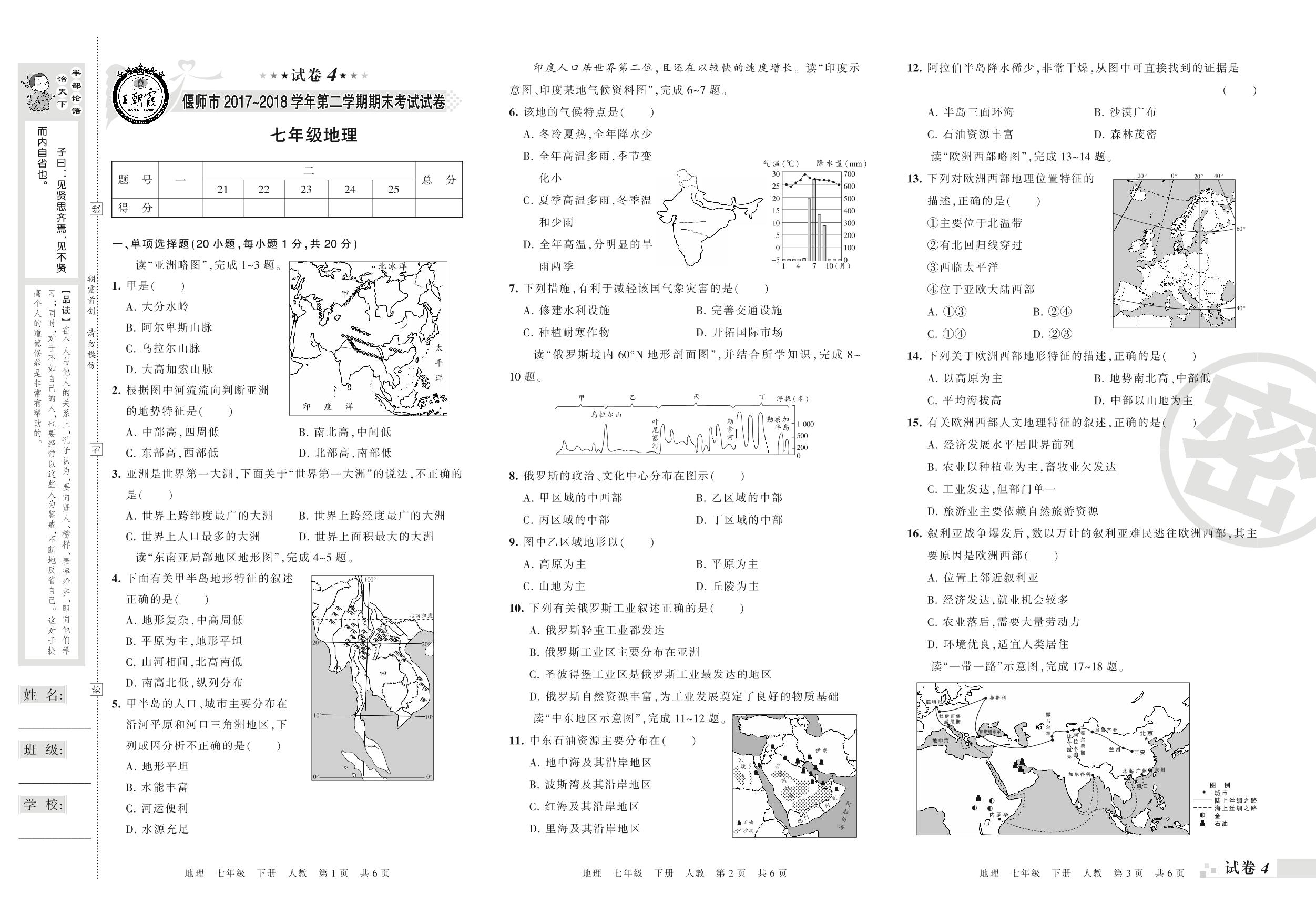 2017-2018学年第二学期偃师市七年级地理试卷(人教版)【4】