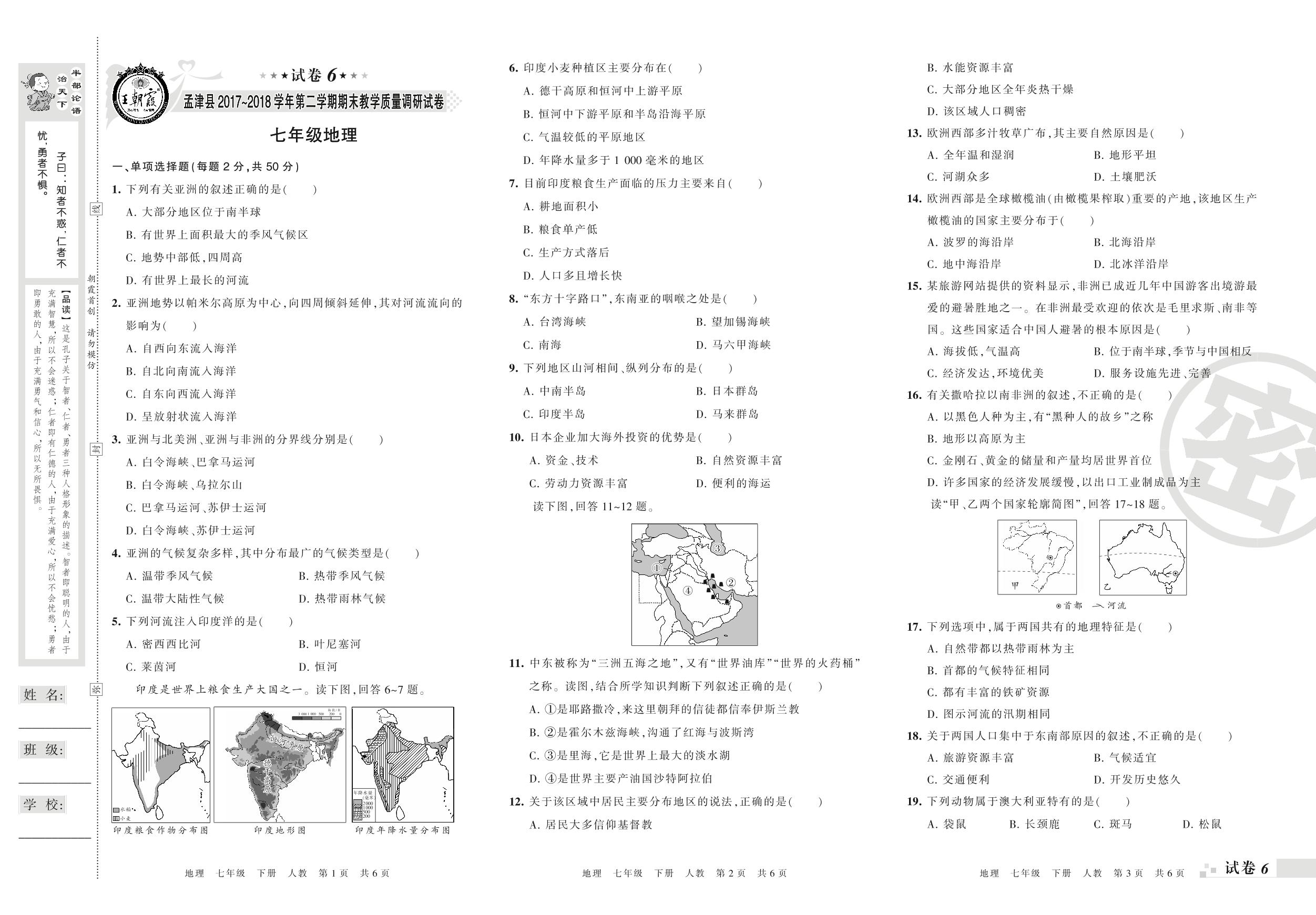 2017-2018学年第二学期洛阳市孟津县七年级地理试卷(人教版)【6】