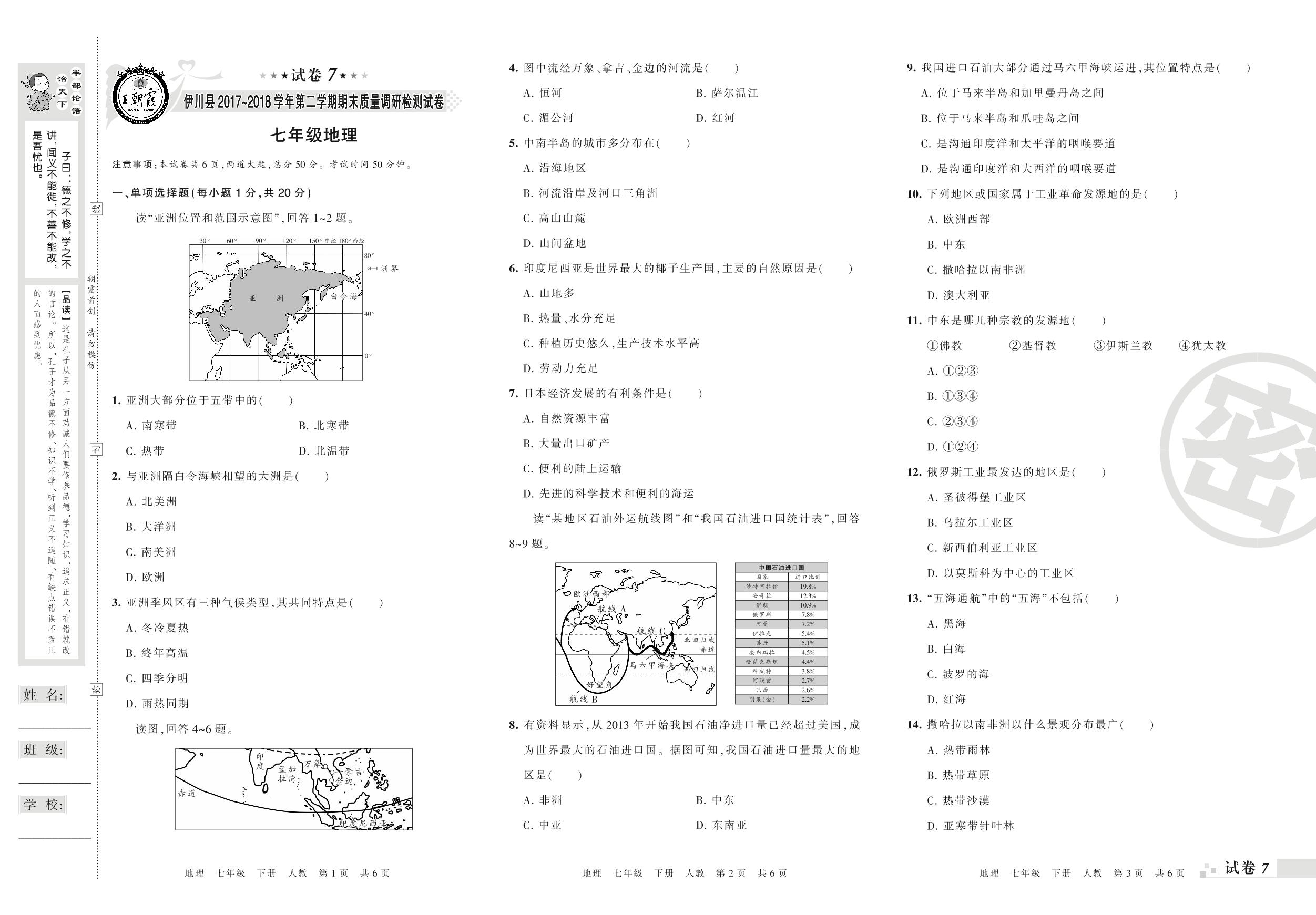 2017-2018学年第二学期洛阳市伊川县七年级地理试卷(人教版)【7】