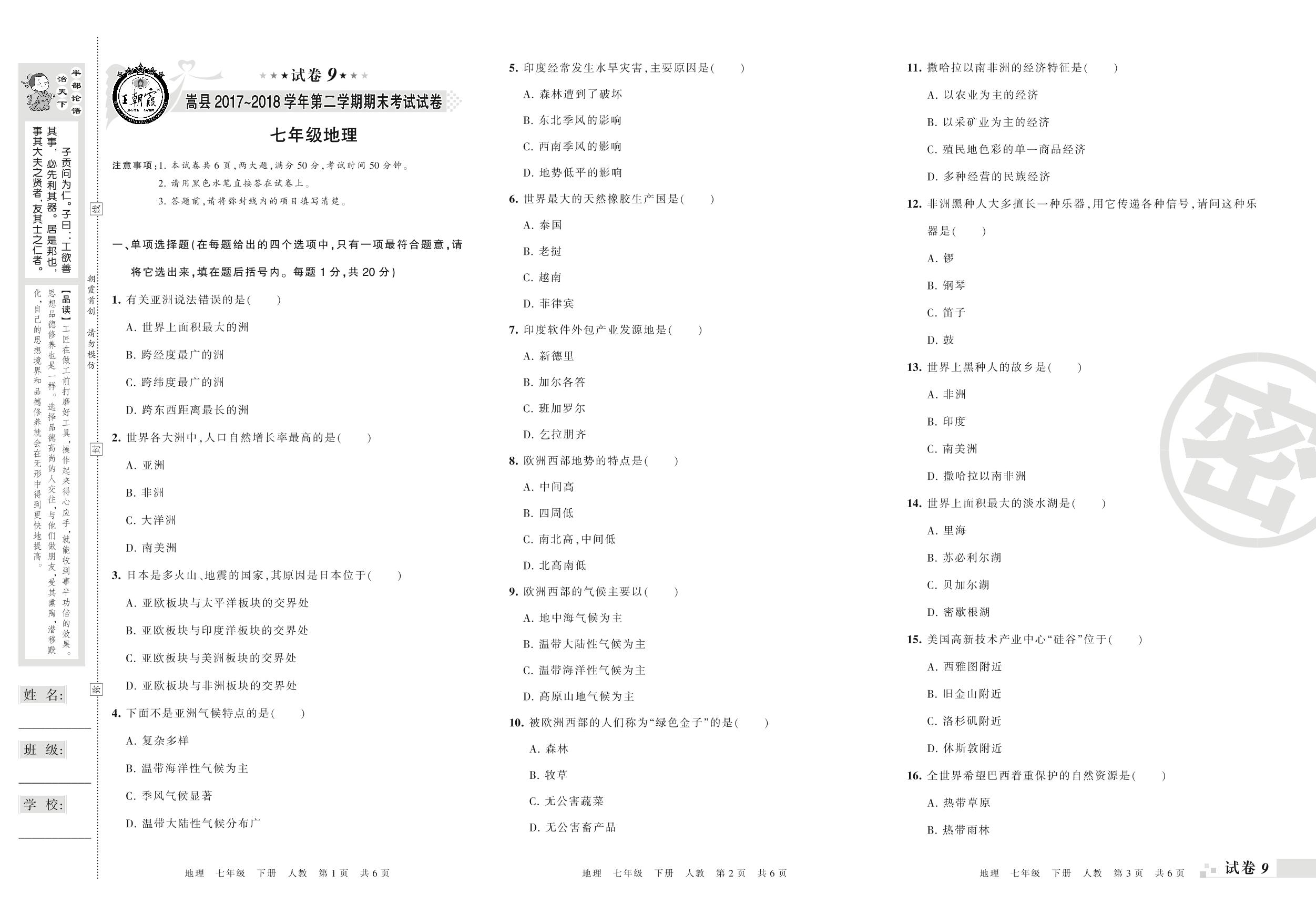 2017-2018学年第二学期洛阳市嵩县七年级地理试卷(人教版)【9】