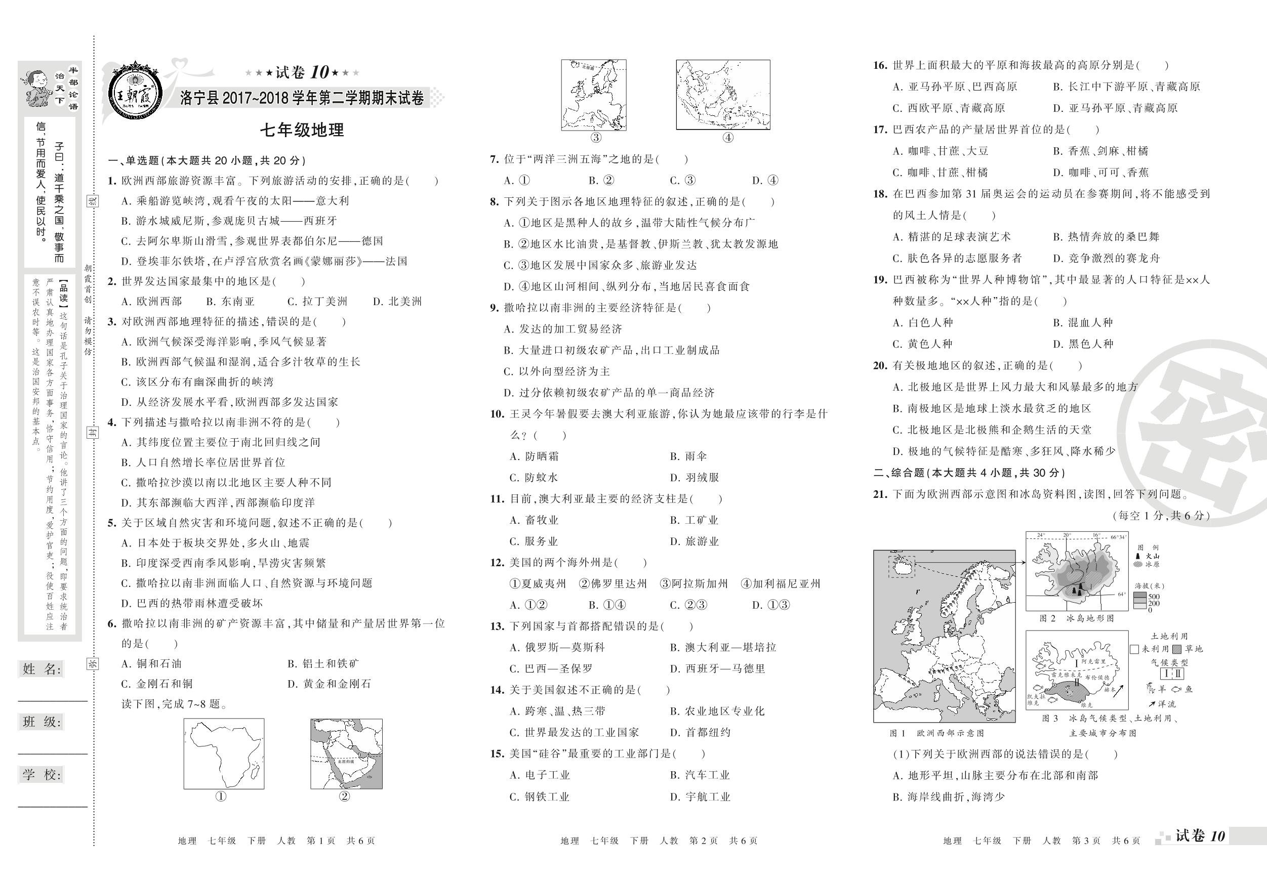 七年级地理人教版下册期末卷