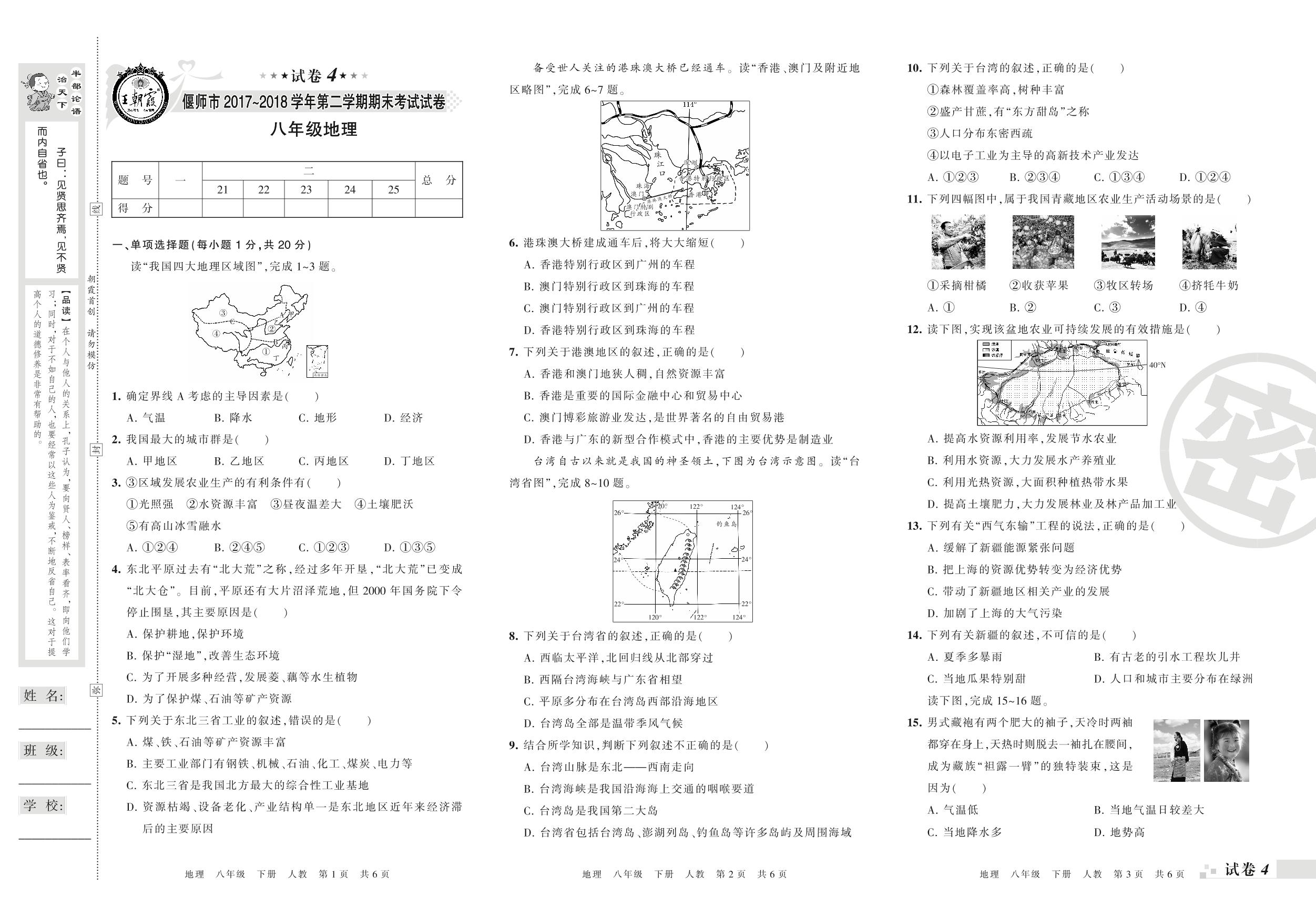 2017-2018学年第二学期偃师市八年级地理试卷(人教版)【4】