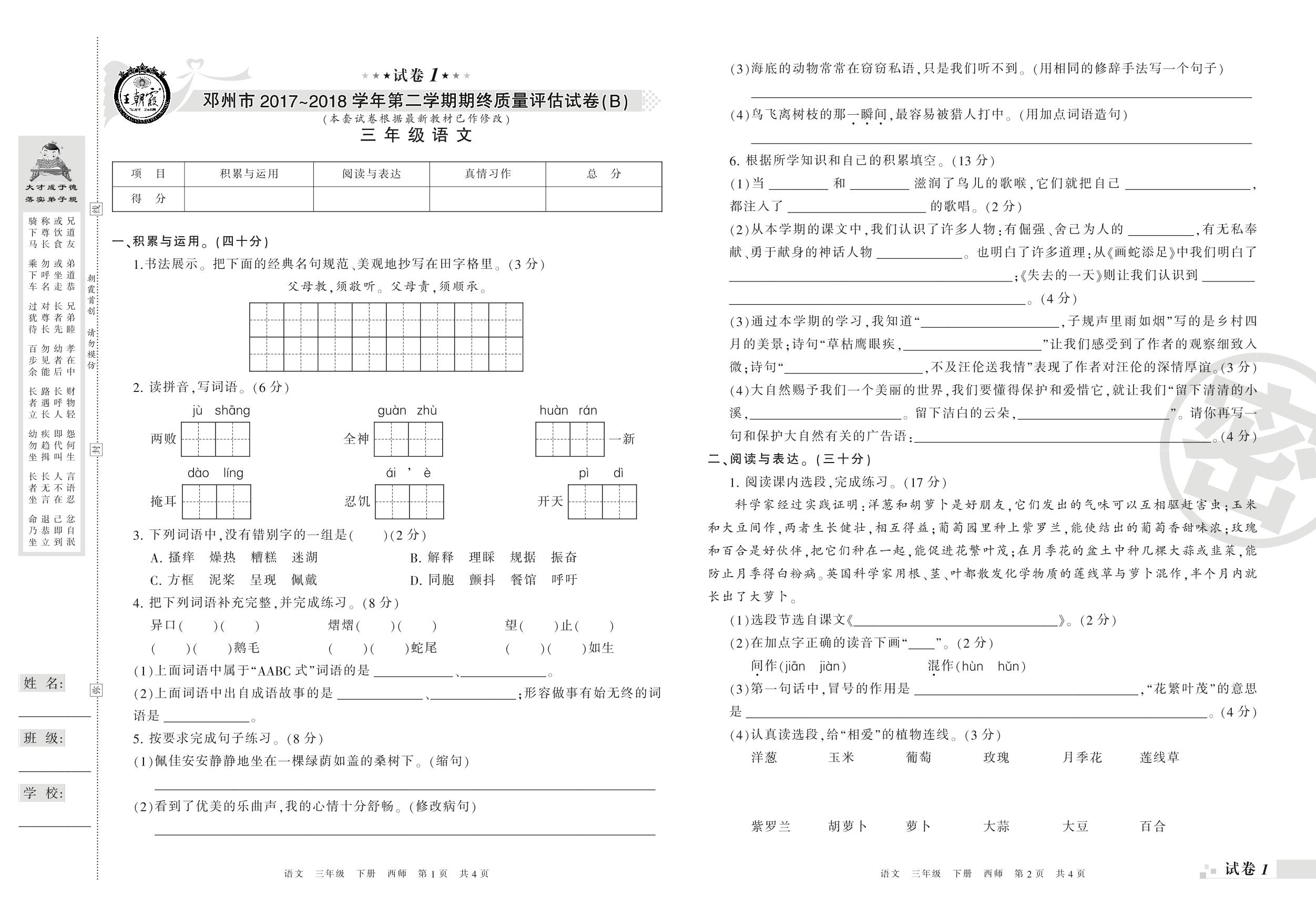 2017-2018学年第二学期邓州市三年级语文试卷(西师版)【1】