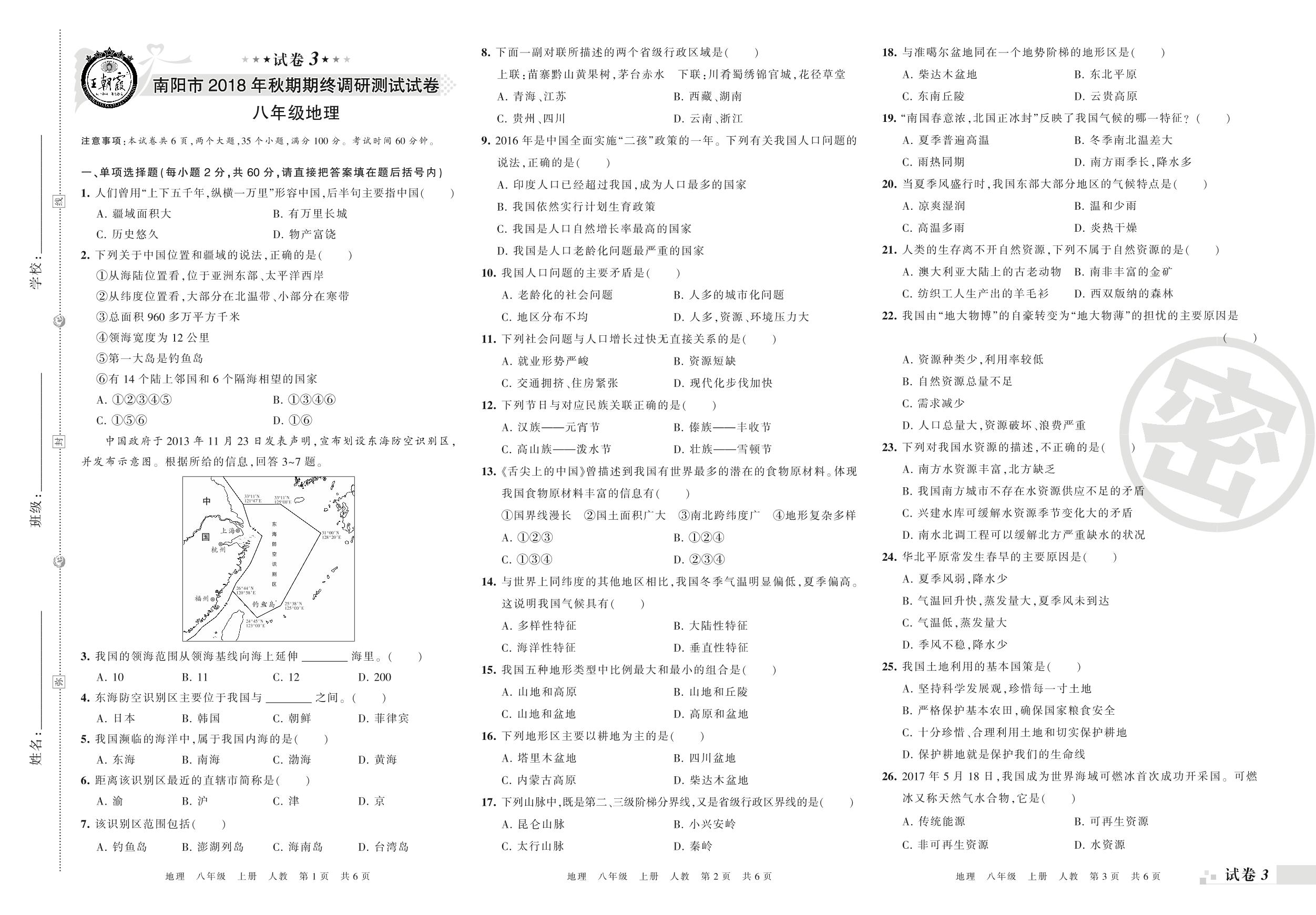 2018-2019学年第一学期南阳市八年级地理试卷(人教版)【3】