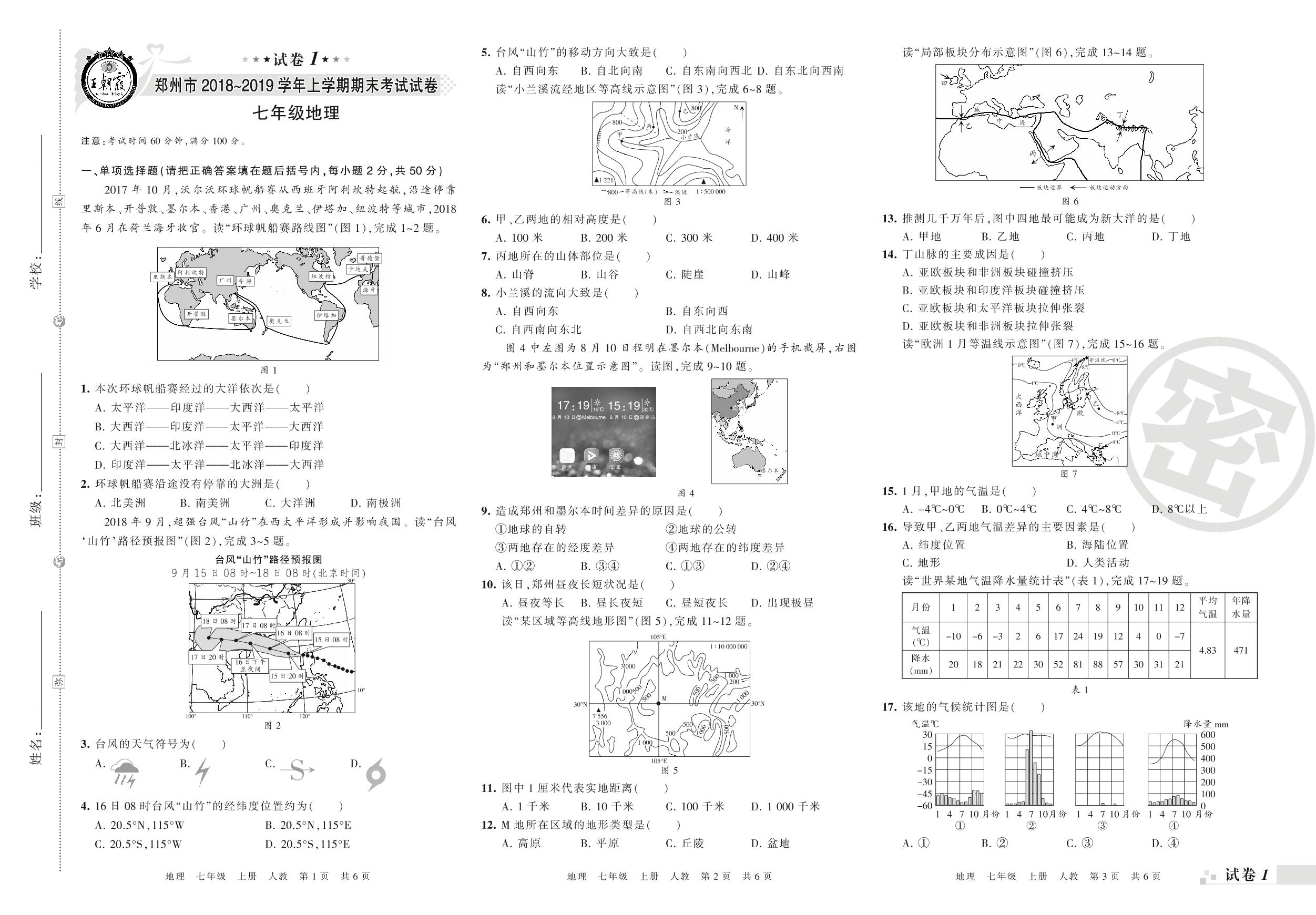 2018-2019学年第一学期郑州市七年级地理试卷(人教版)【1】