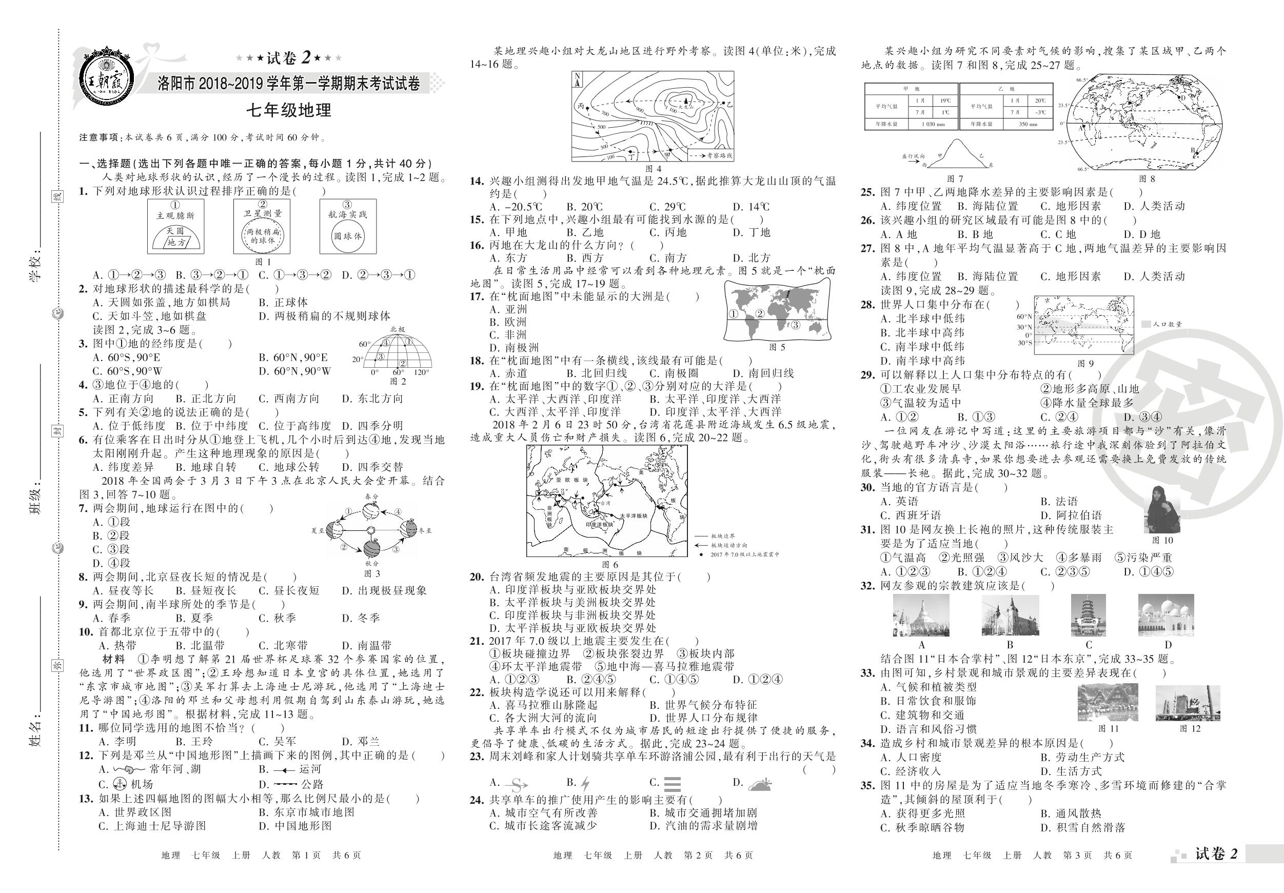2018-2019学年第一学期洛阳市七年级地理试卷(人教版)【2】
