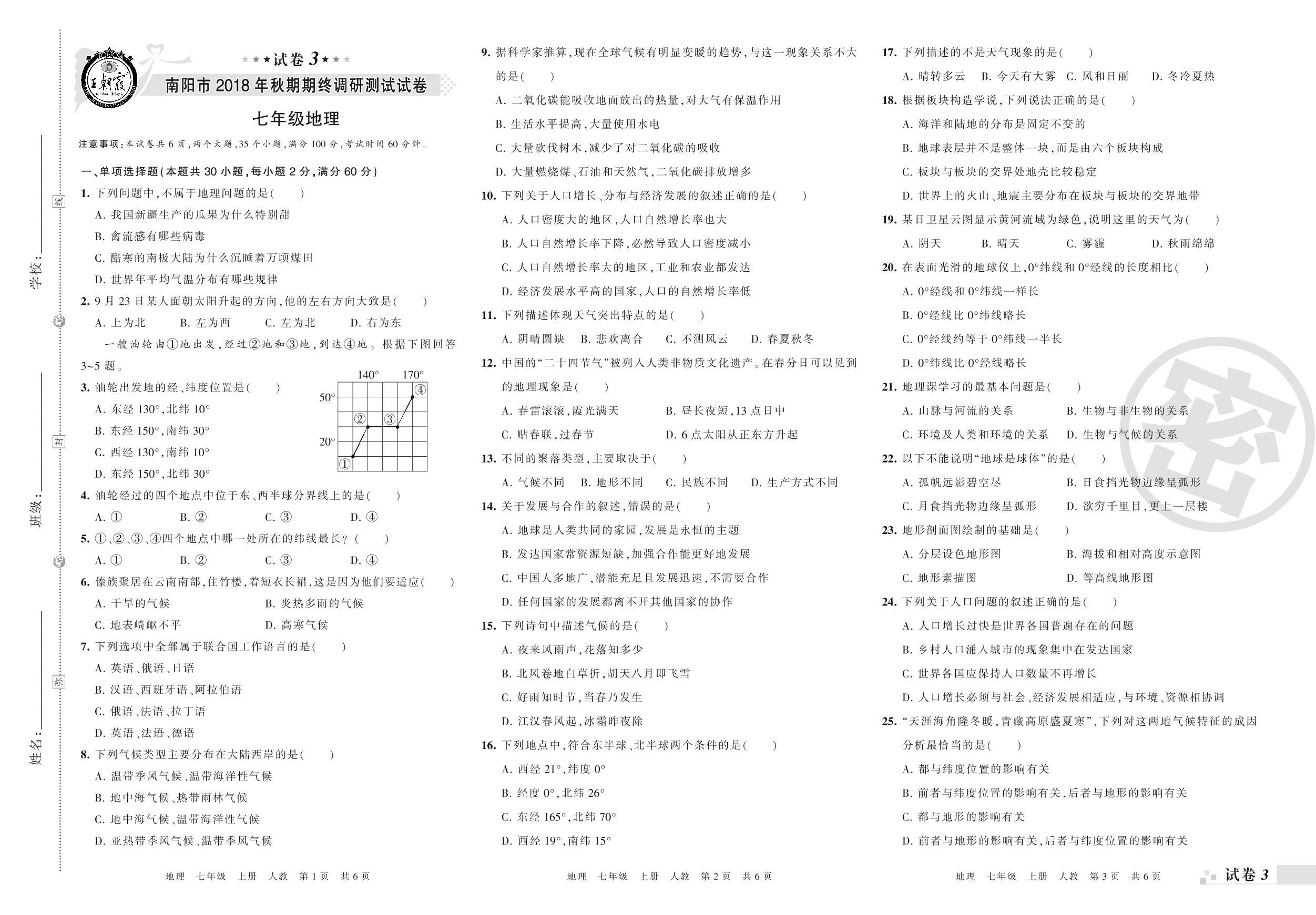 2018-2019学年第一学期南阳市七年级地理试卷(人教版)【3】
