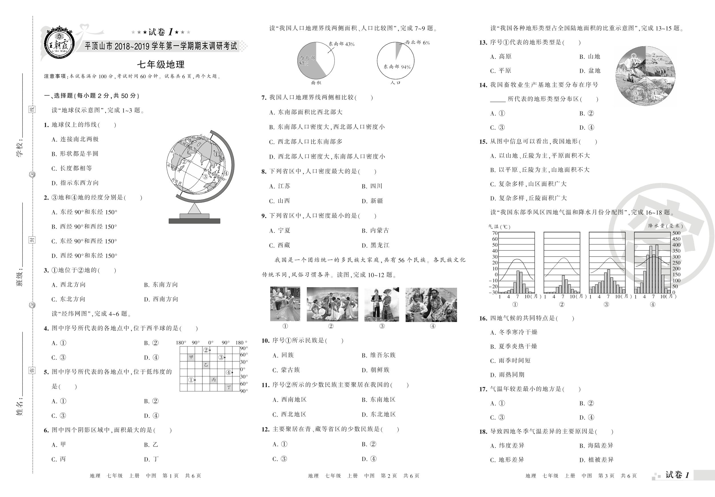 2018-2019学年第一学期平顶山市七年级地理试卷(中图版)【1】