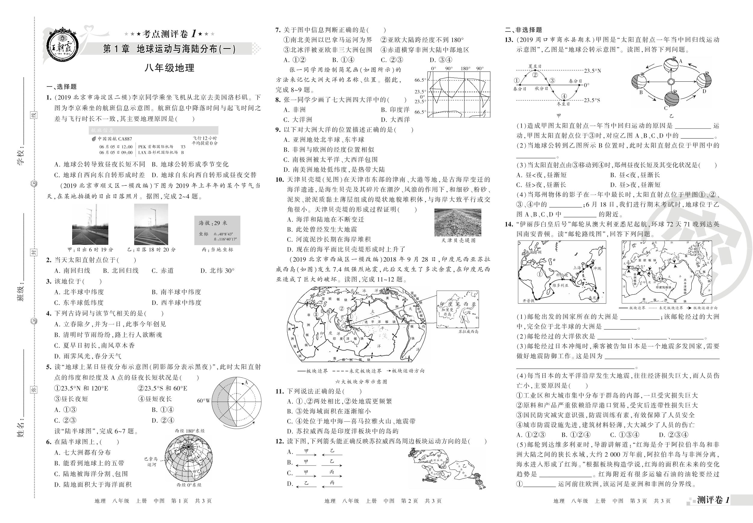 王朝霞期末考点测评卷——第1章 地球运动与海陆分布八年级上册地理(中图版)【0】
