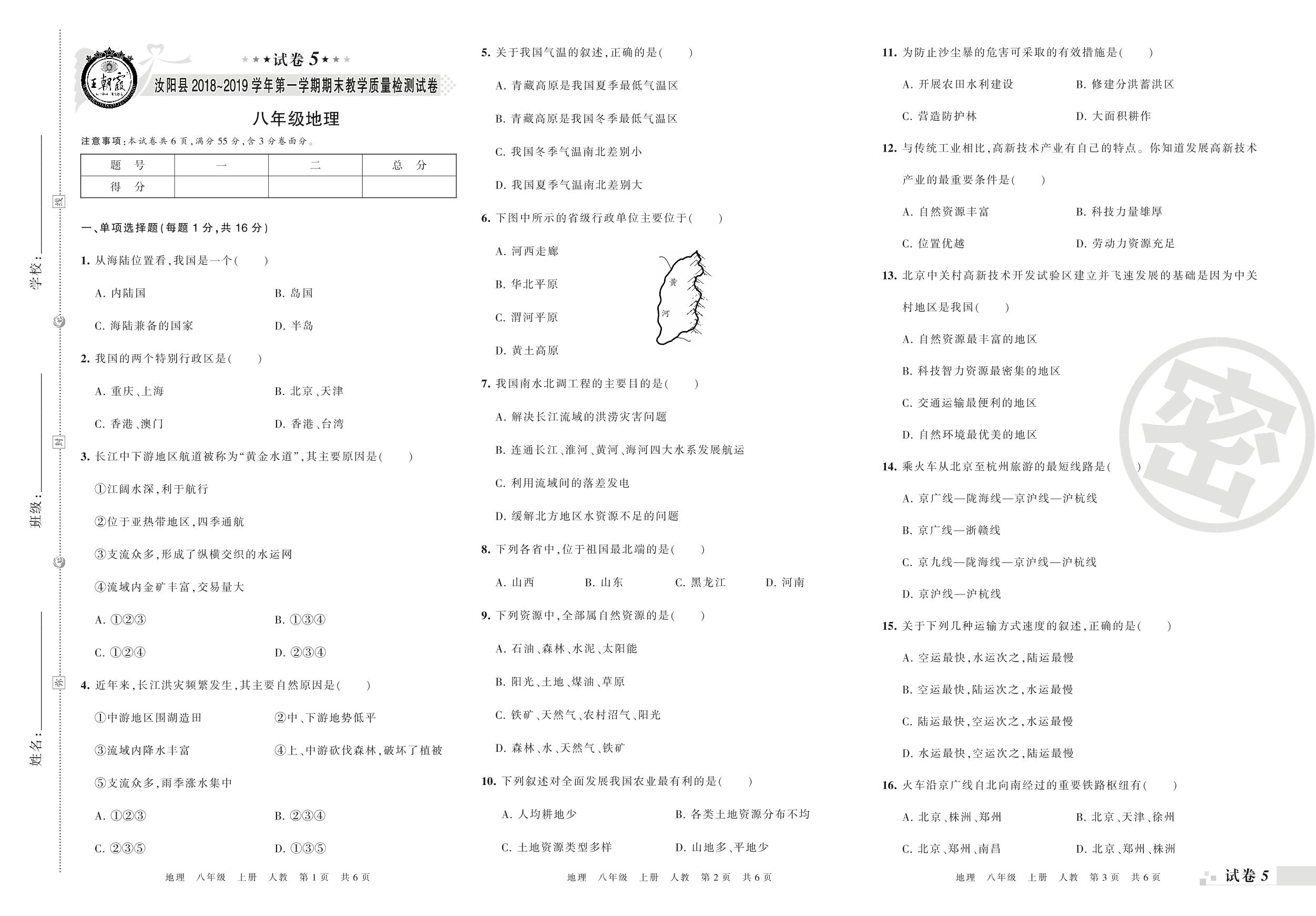 2018-2019学年第一学期洛阳市汝阳县八年级地理试卷(人教版)【5】